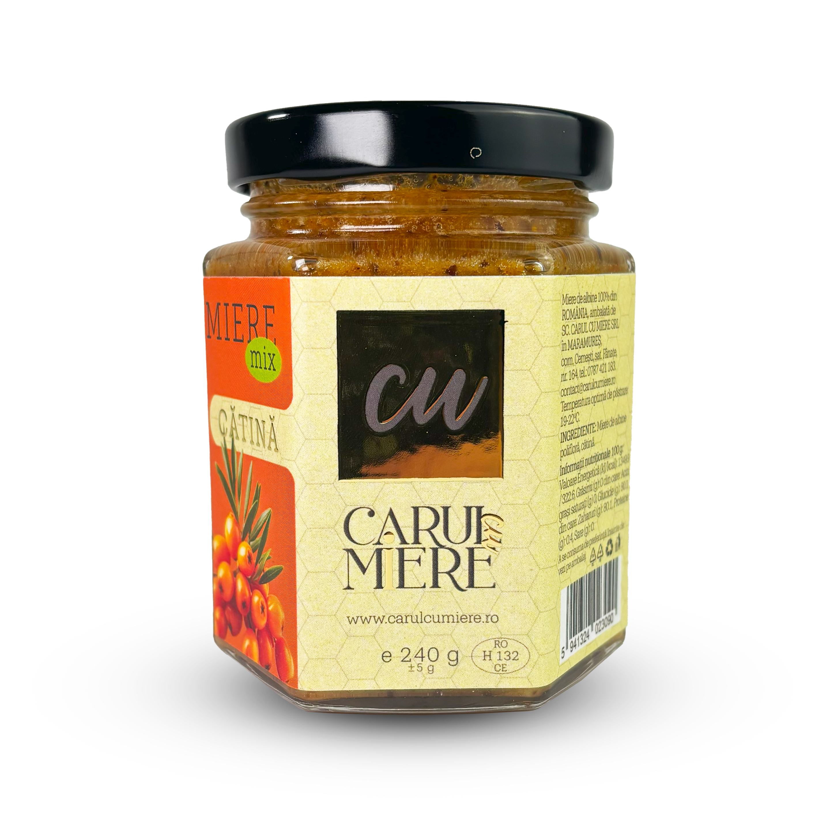 Honey with sea buckthorn is a delicious and healthy blend, made by mixing natural bee honey with 100% natural sea buckthorn powder produced in Romania. Sea buckthorn (Hippophae rhamnoides) is a shrub bearing small orange berries, rich in nutrients and antioxidants beneficial for health.
