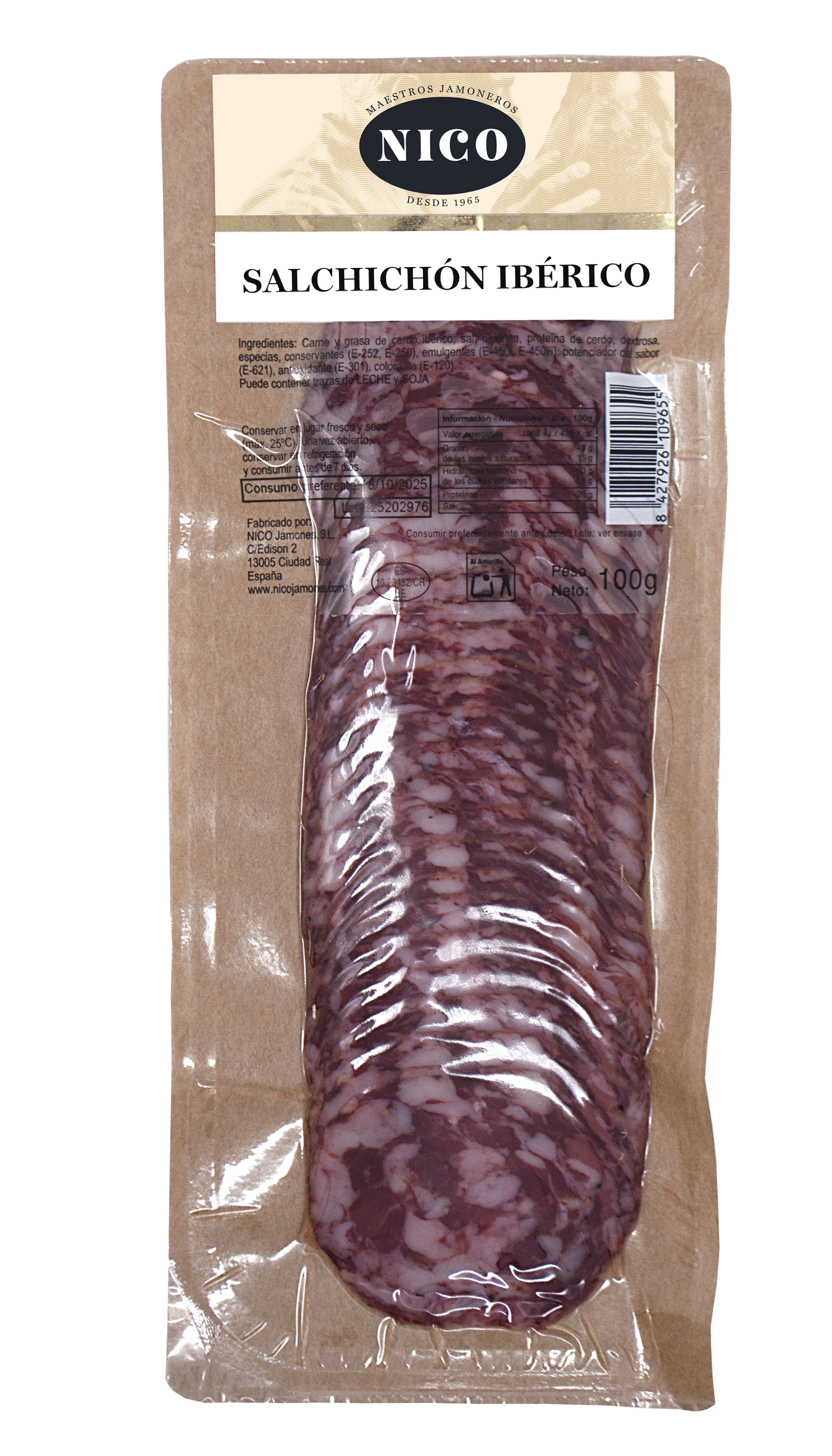 Discover 100% Iberian Salchichon: smooth texture, intense flavor. Sliced for convenience, perfect for tapas, appetizers or any dish.