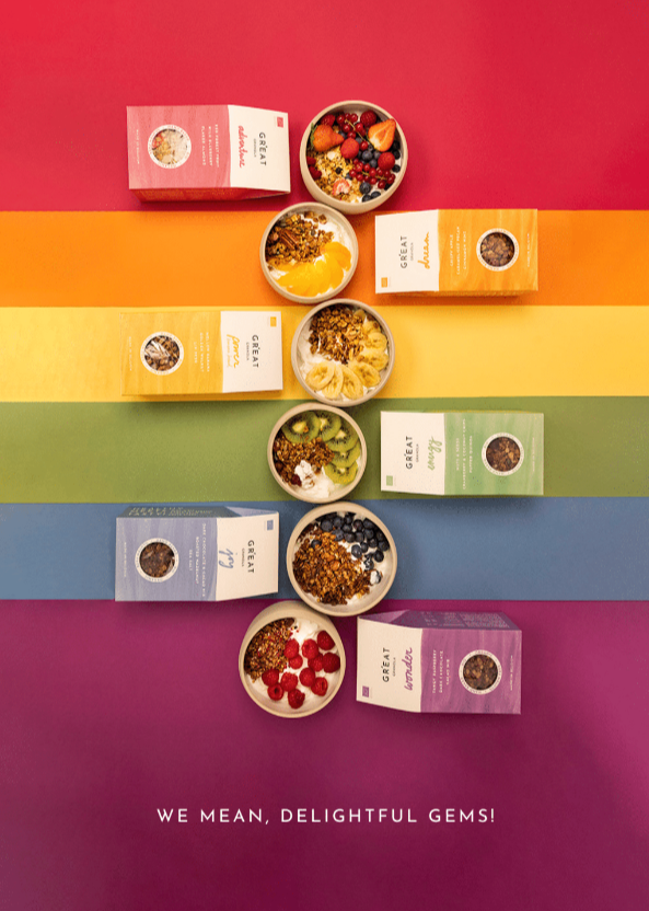 Great Moments brings together two Brussels‑based breakfast brands, GR’EAT Granola and La Favo, specializing in handcrafted, 100 % organic, gluten‑free granolas, porridges and spreads, all produced in a small atelier. GR’EAT Granola was founded in 2015 by Amélie with a mission to make healthy eating delicious, while La Favo originated from a passion for superfood quinoa–based cereals that invigorate the morning routine.