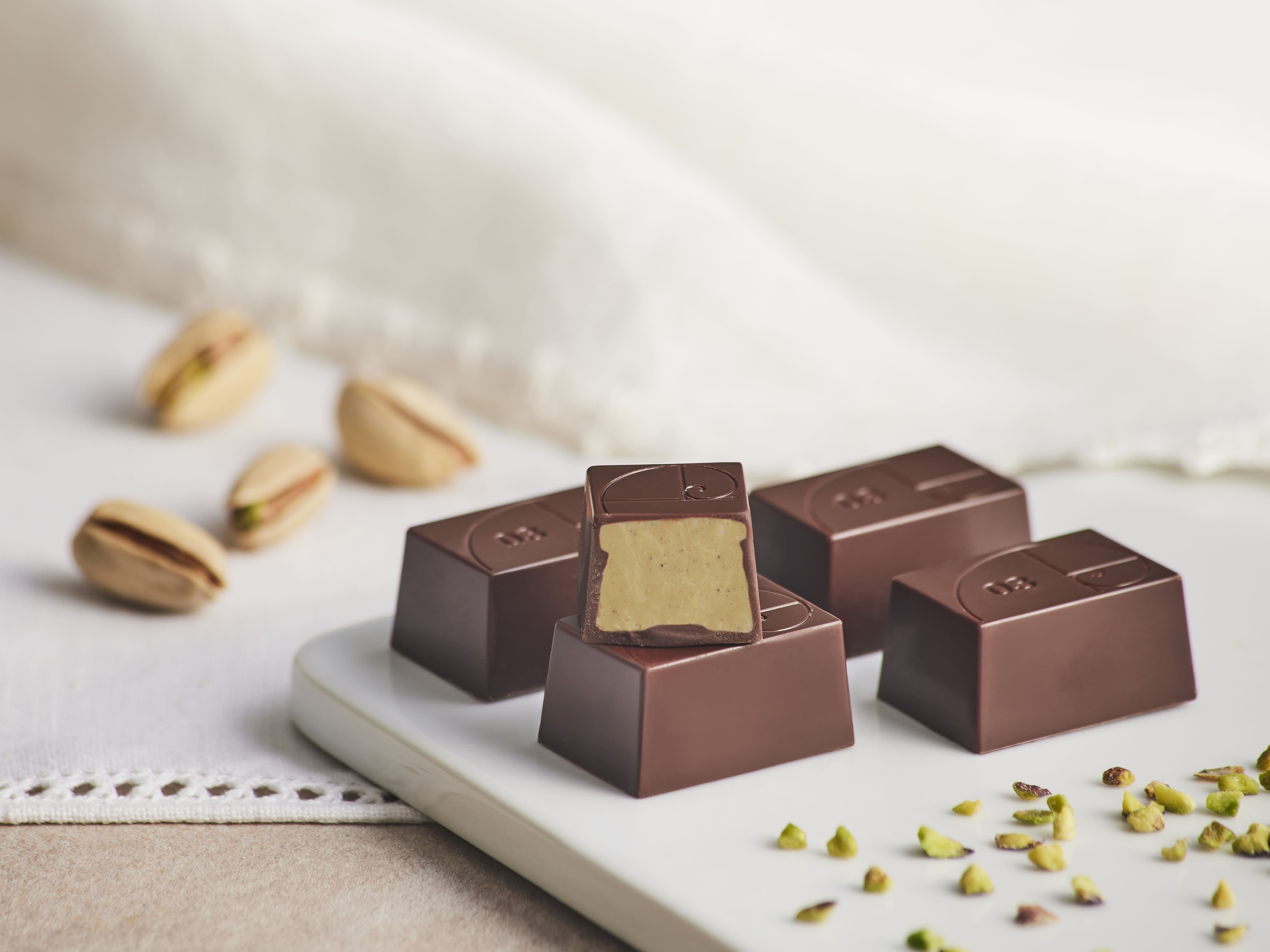 Bonbons assorted flavors: Giffoni Round Hazelnut, Blood Orange, "Pistacchio Verde di Bronte DOP", Cocoa Nibs San José, Peach from Volpedo, “Sale Marino di Trapani PGI” & Taggiasca Olive Oil.