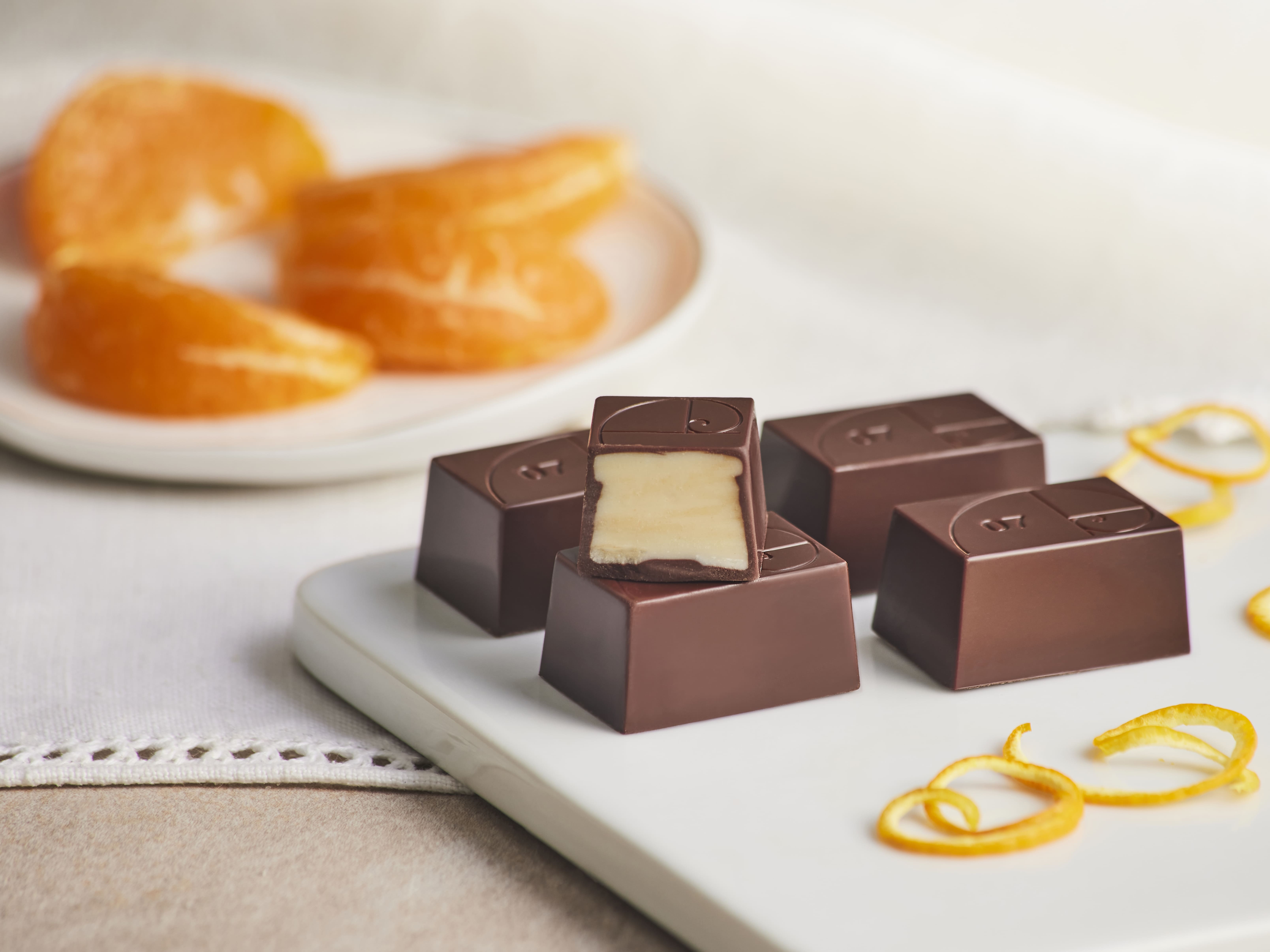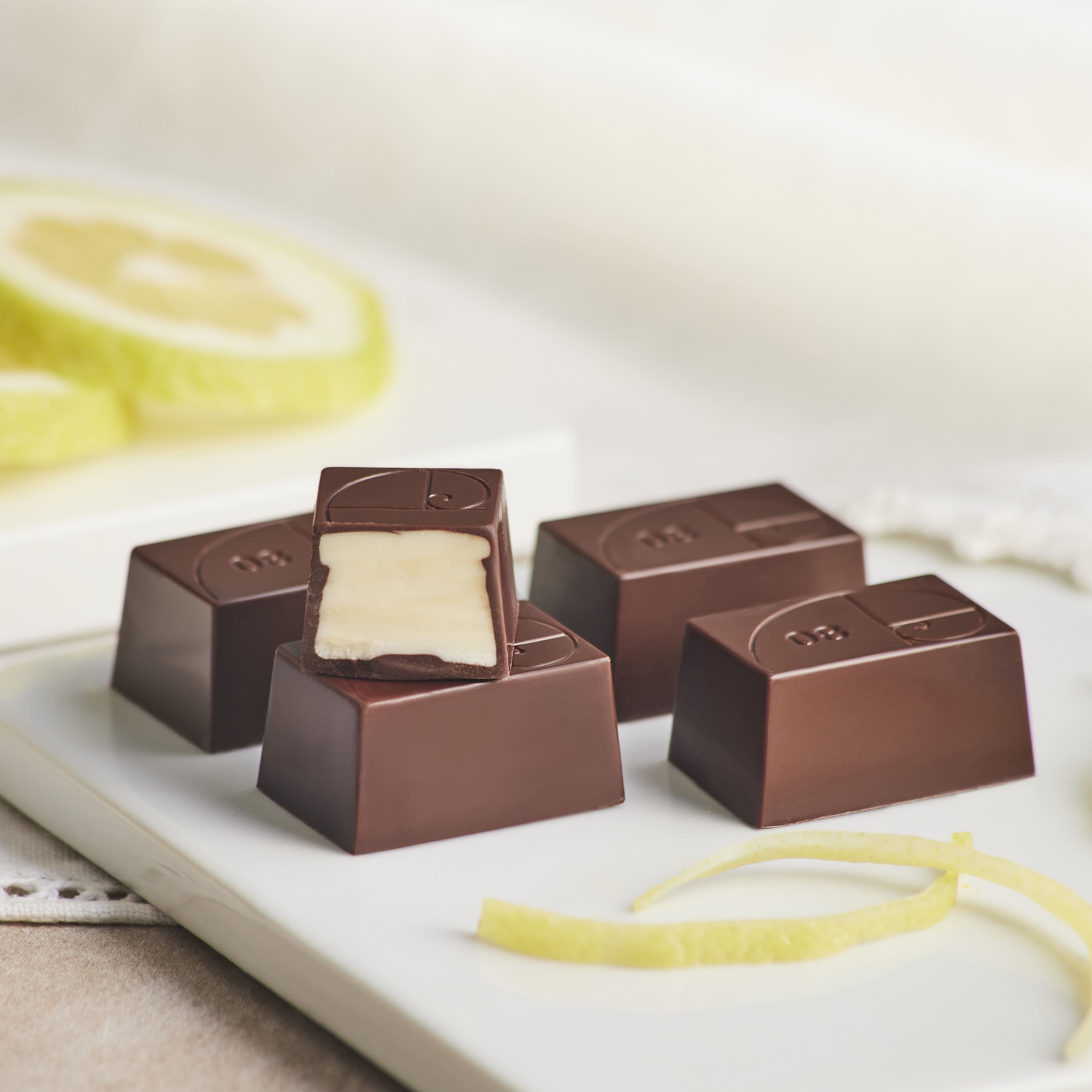 Bonbons assorted flavors: Giffoni Round Hazelnut, Blood Orange, "Pistacchio Verde di Bronte DOP", Cocoa Nibs San José, Peach from Volpedo, “Sale Marino di Trapani PGI” & Taggiasca Olive Oil, Late Tangerine from Ciaculli, Lemon from Cinque Terre.
