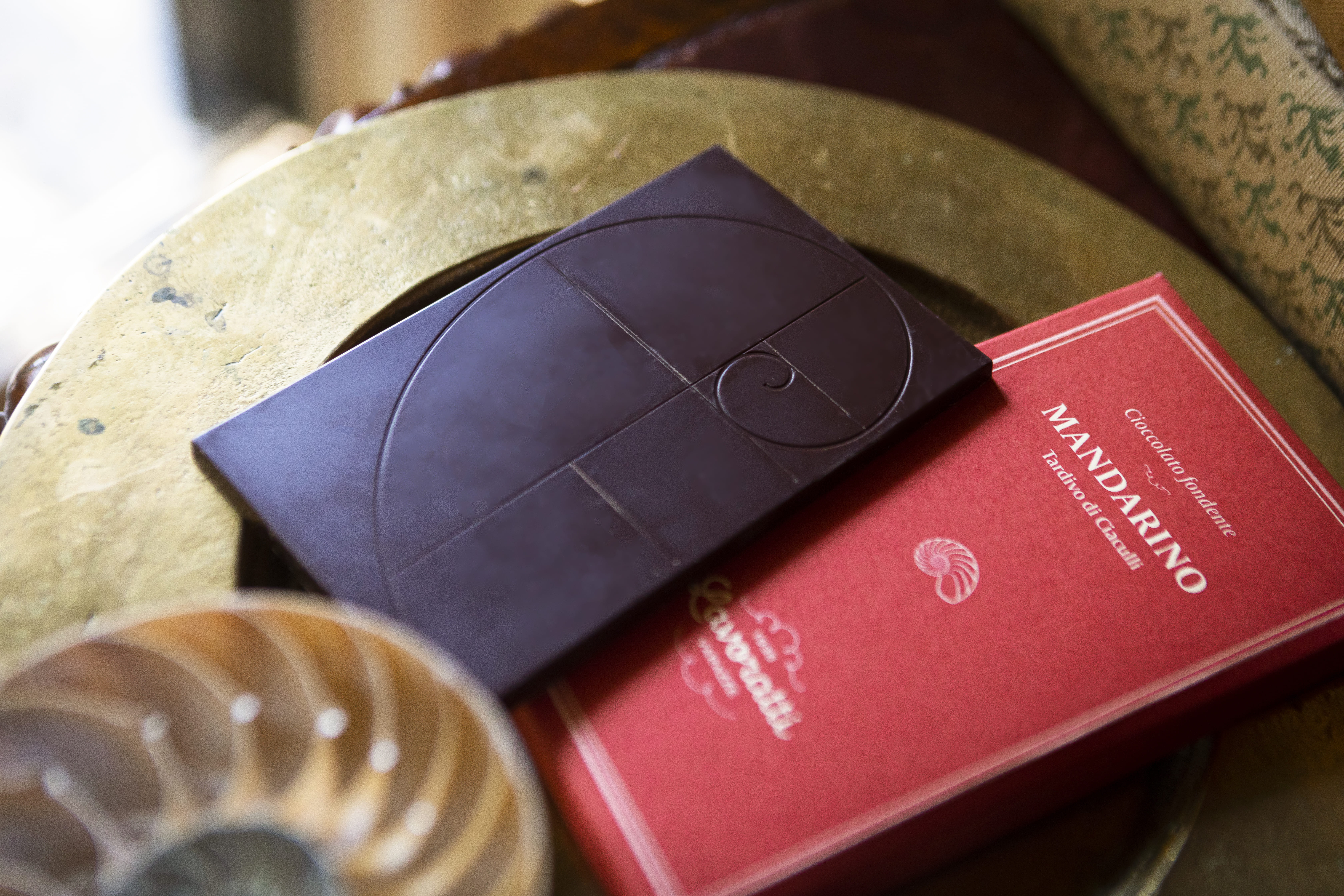 Ingredients: cocoa butter, cocoa paste, full fat powder milk, powder cream, Late Tangerine from Ciaculli, essential tangerine oil, sugar, emulsifier (non-OGM soy lecithin).