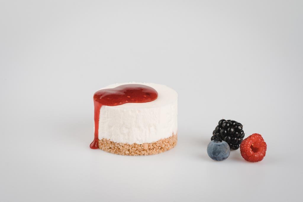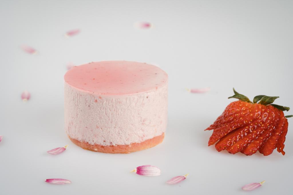 Una purea di fragole con panna, su un foglio di pandispagna, con un cuore di sola purea, rendono il prodotto attraente e delicato.
