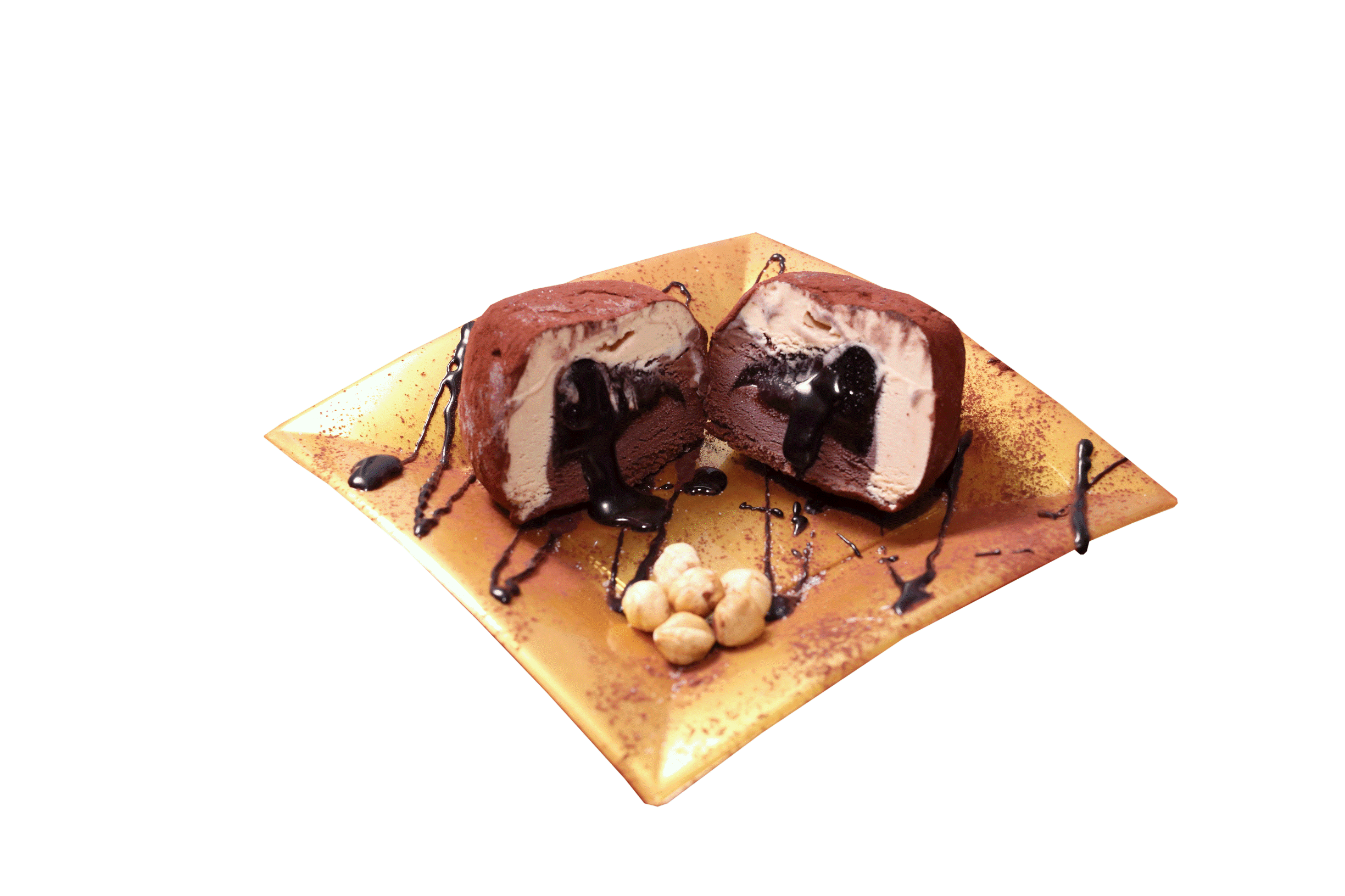 gelato alla nocciola e al cacao, che racchiudono al loro interno una fonduta di cacao
