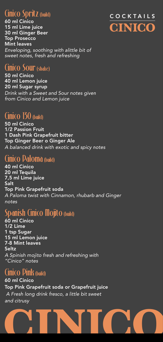 DIGESTIF The three spices have digestive properties; Cinico is ideal cold or with 4-5 ice cubes and a lime slice