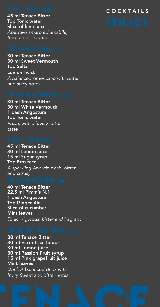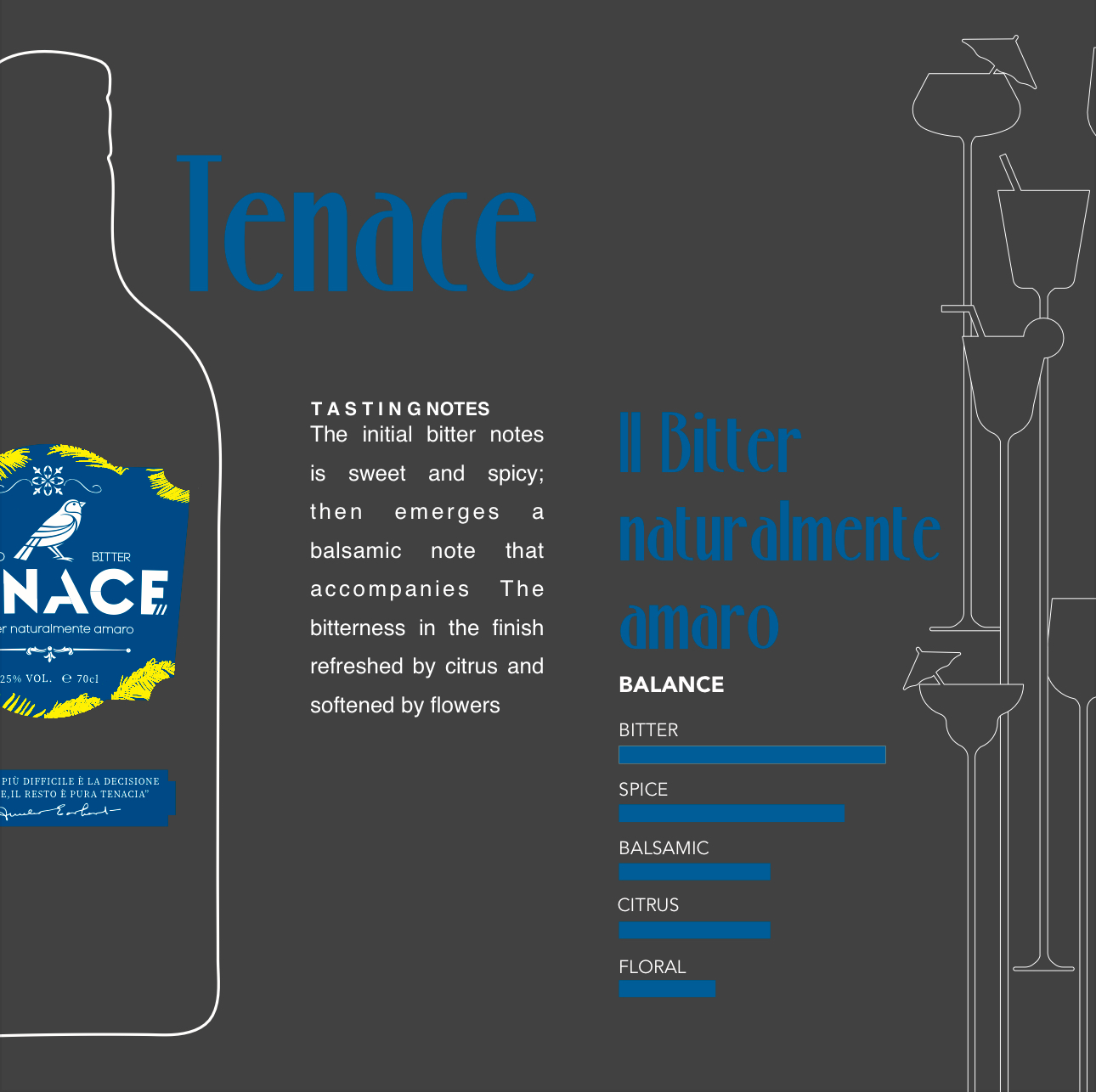 Tenace bitter is created with 16 of the most fascinating herbs, spices, flowers and citrus macerated in a pure alchol grain.