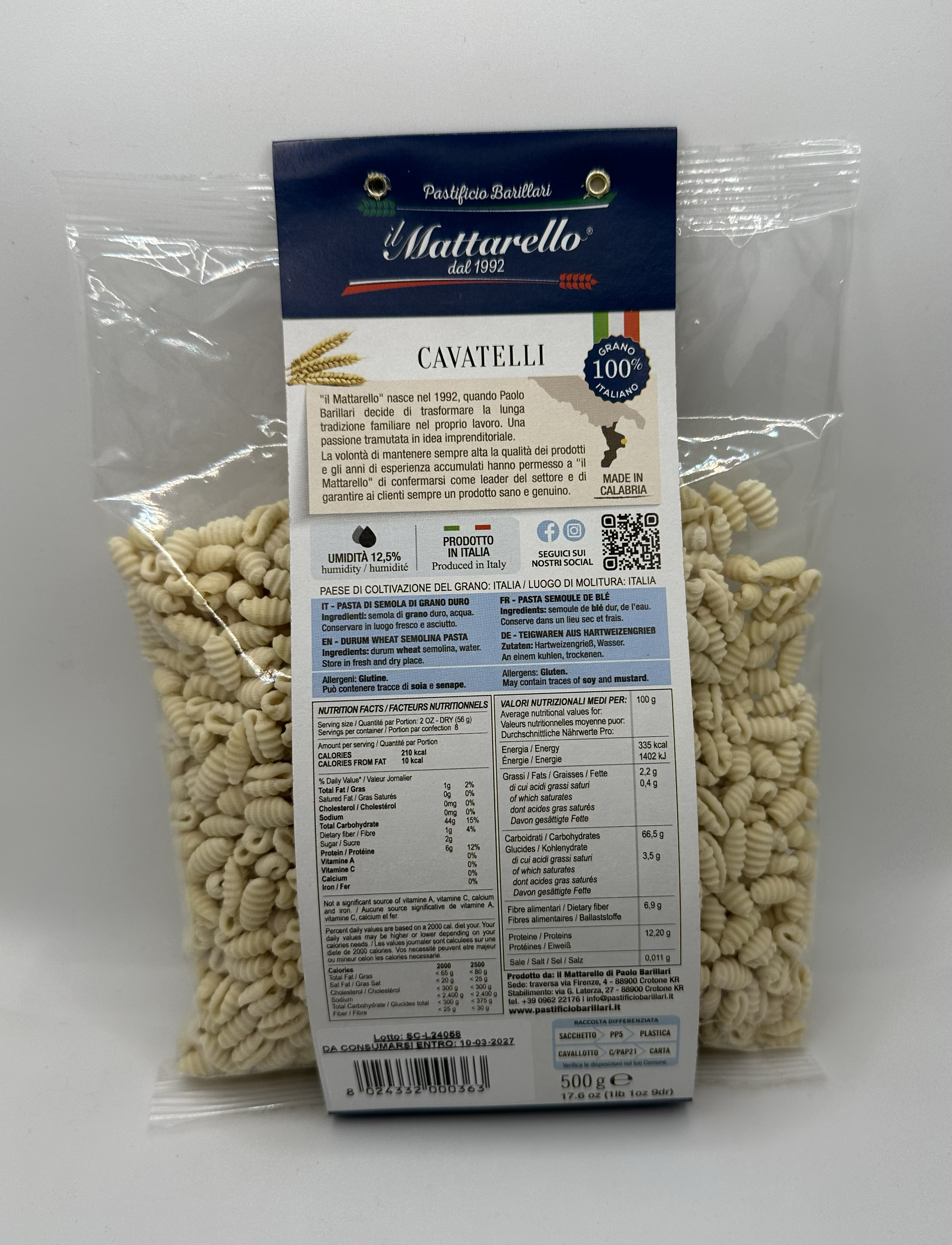 ingredients: durum wheat semolina (100% Italy) and water. Packaging: 500 gr. DRY PASTA. Maxium production capacity: 300 kg/day.