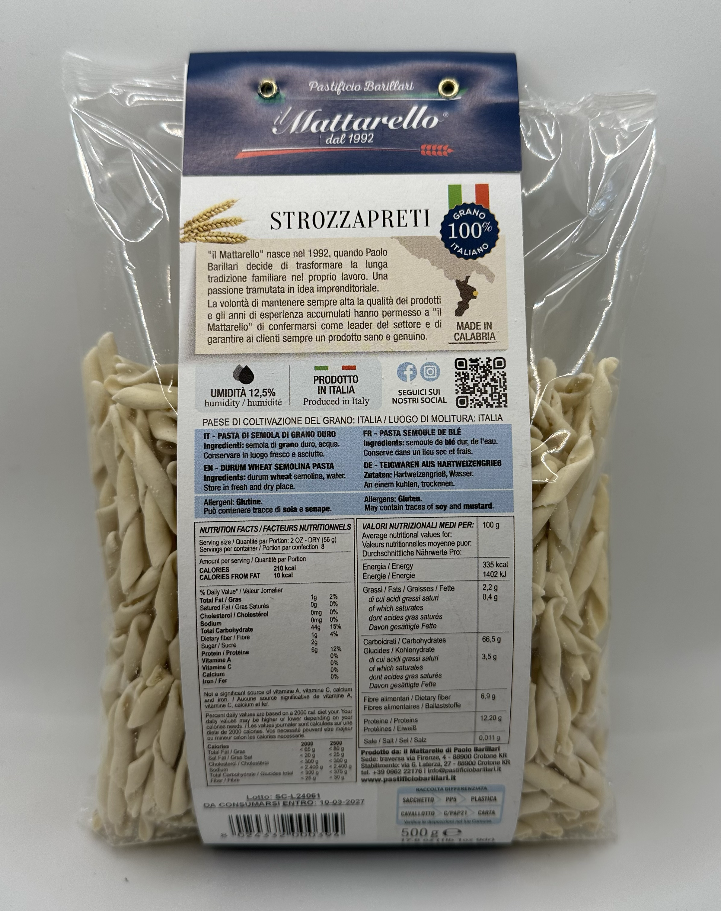 ingredients: durum wheat semolina (100% Italy) and water. Packaging: 500 gr. DRY PASTA. Maxium production capacity: 300 kg/day.