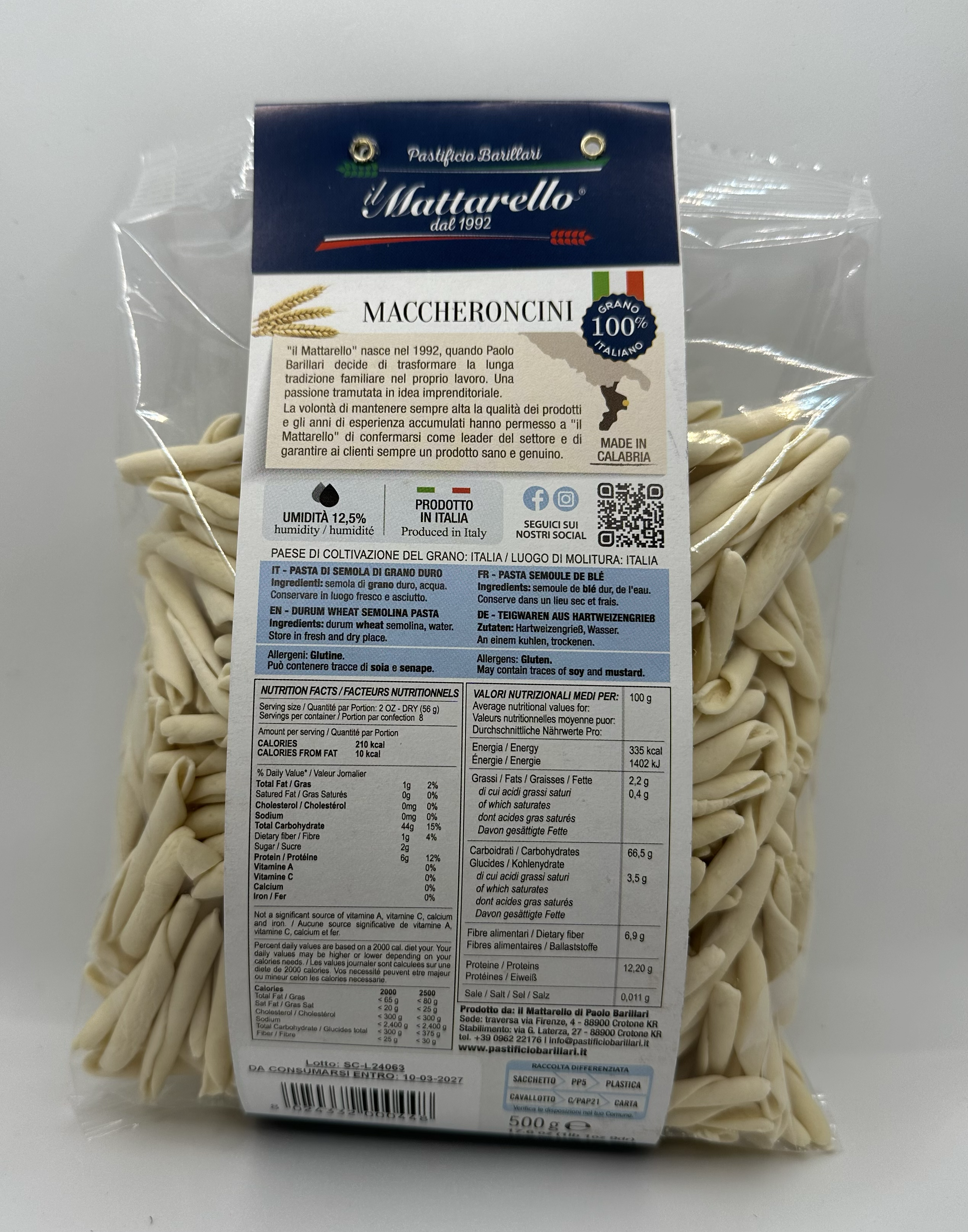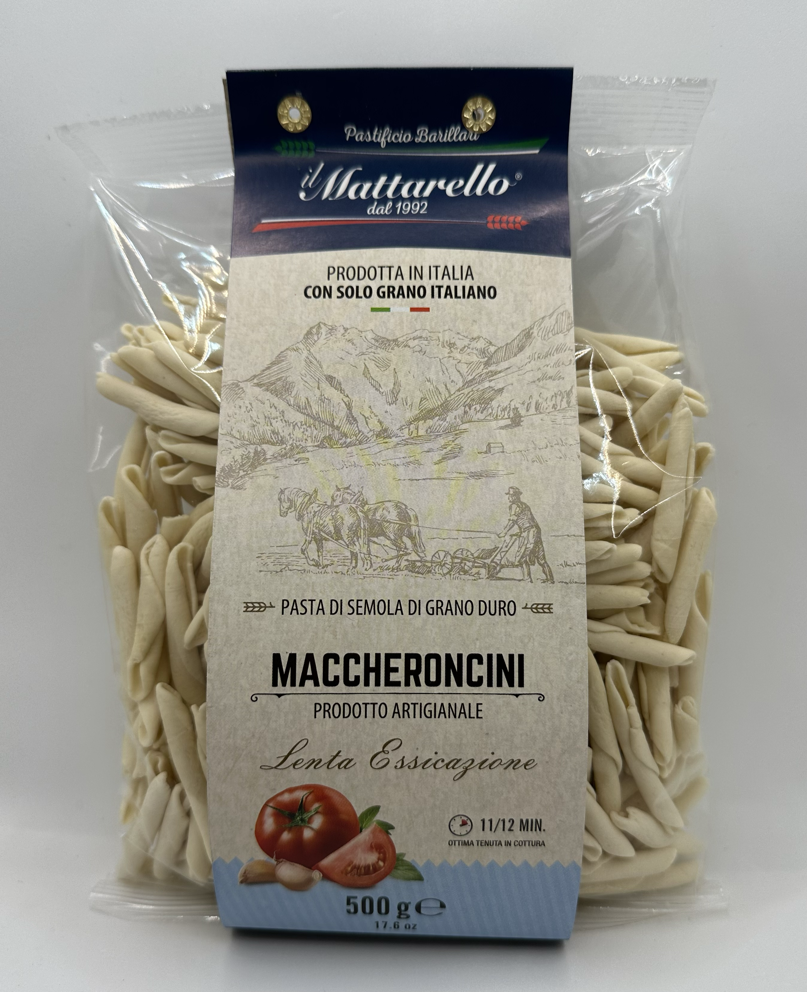 ingredients: durum wheat semolina (100% Italy) and water. Packaging: 500 gr. DRY PASTA. Maxium production capacity: 300 kg/day.