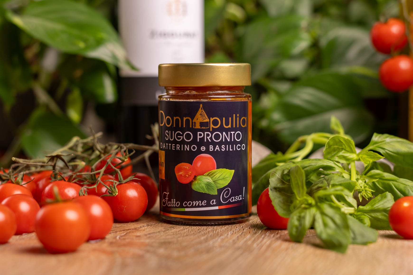 Ready-to-use sauce/condiment with datterino tomatoes and basil