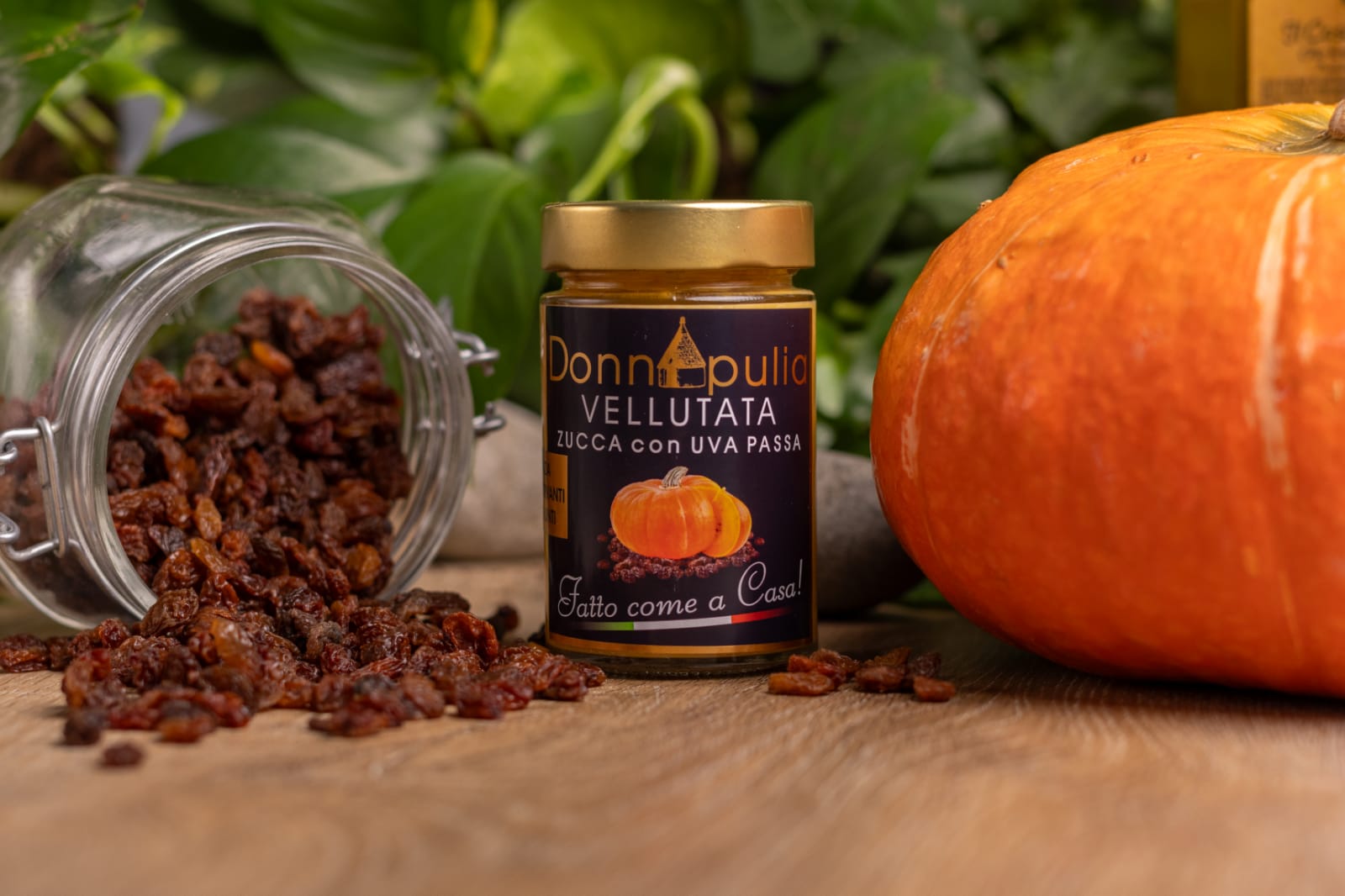 Ingredients: pumpkin 64.5%, water, cream (milk, carrageenan stabilizer), potatoes 3.5%, extra virgin olive oil 3.5%, sultanas, salt, flavourings, pepper, thyme, antioxidant: ascorbic acid Allergens : milk and milk-based products, celery and celery-based products.