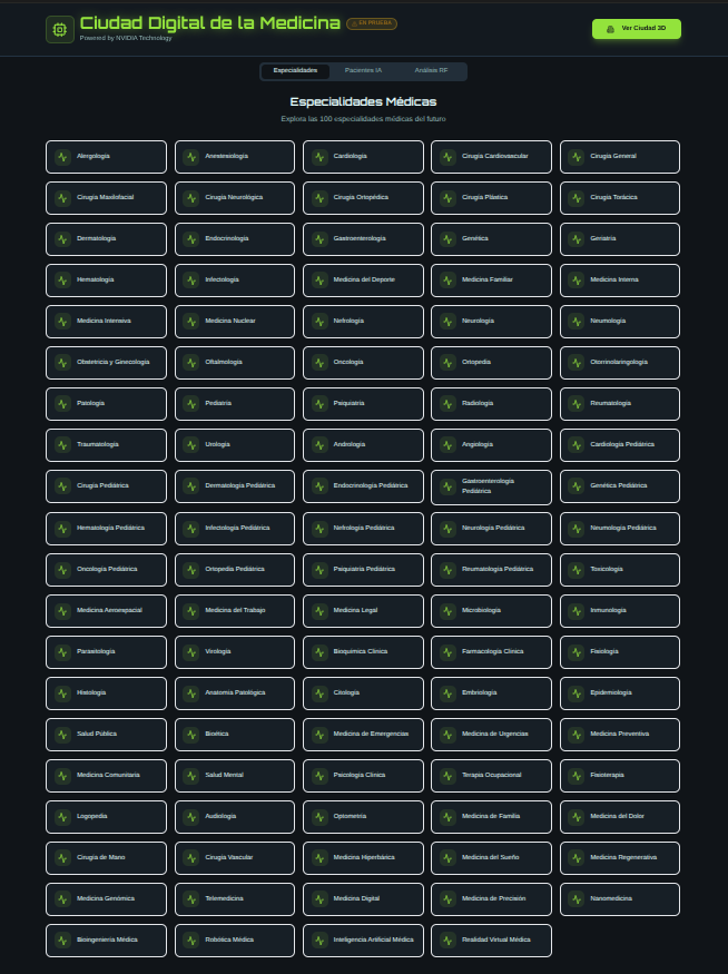 Medical Intelligence Grid is a 3D data‑visualization platform designed to support strategic research planning across emerging medical specialties and biomedical technologies. The system enables comparative mapping of over 50 domains, including genomics, AI‑driven medicine, virtual care, integrative therapies and advanced diagnostics, offering researchers a structured overview of innovation trajectories and thematic clustering.