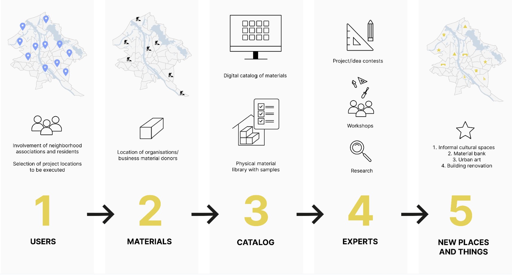 In the image- our concept for how the project could take shape locally. Example of the process that begins with community involvement and ends with built outcomes—informal cultural spaces, street furniture, urban interventions or functional buildings—created using transparent and collaborative methods.