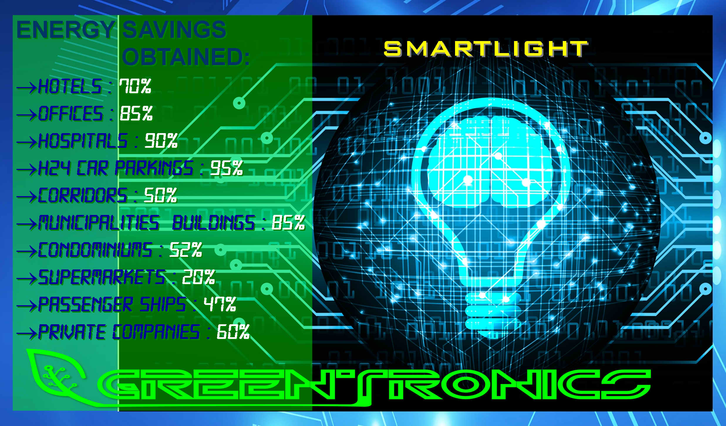 Smartlight is an universal electronic device for automatic adaptive control of indoor lighting with extremely low payback time, being confirmed in various publications "the best solution for energy efficiency in lighting systems" because it is the technology with the lowest payback time on the market: 1 year on average for the return of the investment. Equipped with its artificial intelligence control system, it is perfectly compatible with any type of lamp and with any type of electrical plant, it allows to obtain an energy saving which in some cases can be up to over 90%. The Smartlight device has also the advantage of non-invasive installation that occurs quickly and without changing the existing lighting system. ENERGY SAVINGS OBTAINED: MUNICIPALITIES: 85% HOSPITALS: 90% SUPERMARKETS: 20% HOTELS: 70% CAR PARKING: 95% PRIVATE COMPANIES: 60% SHIPS: 47% SCHOOLS: 52%