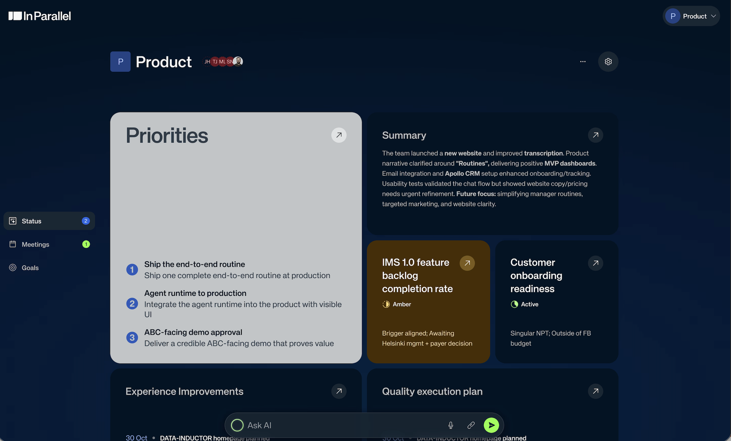 In Parallel is an execution intelligence company focused on helping senior leaders in Pharma and Biotech turn portfolio complexity into decisive action. We work with organizations running large, multi-program portfolios where strategy, execution, and governance drift apart — not because of lack of tools, but because insight arrives too late or in fragmented form. In Parallel transforms everyday execution signals (meetings, portfolio updates, decisions, risks) into a continuously updated, decision-ready execution view. Our platform is designed for Portfolio, Program, and Project Management leaders operating in regulated, matrixed environments. Instead of adding another reporting layer, In Parallel connects directly to the moments where execution reality is created — portfolio reviews, governance meetings, cross-functional syncs — and converts them into structured insights, risks, commitments, and plan changes with full ownership and auditability. This allows PPM leaders to move from reactive reporting to proactive portfolio steering. In Parallel is perfectly suited for enterprise pharma and biotech organizations managing R&D pipelines, transformation programs, and complex delivery portfolios. We help PPM leaders reduce decision latency, improve governance quality, and maintain a single, trusted execution narrative across functions, geographies, and leadership levels — without increasing administrative burden on teams.
