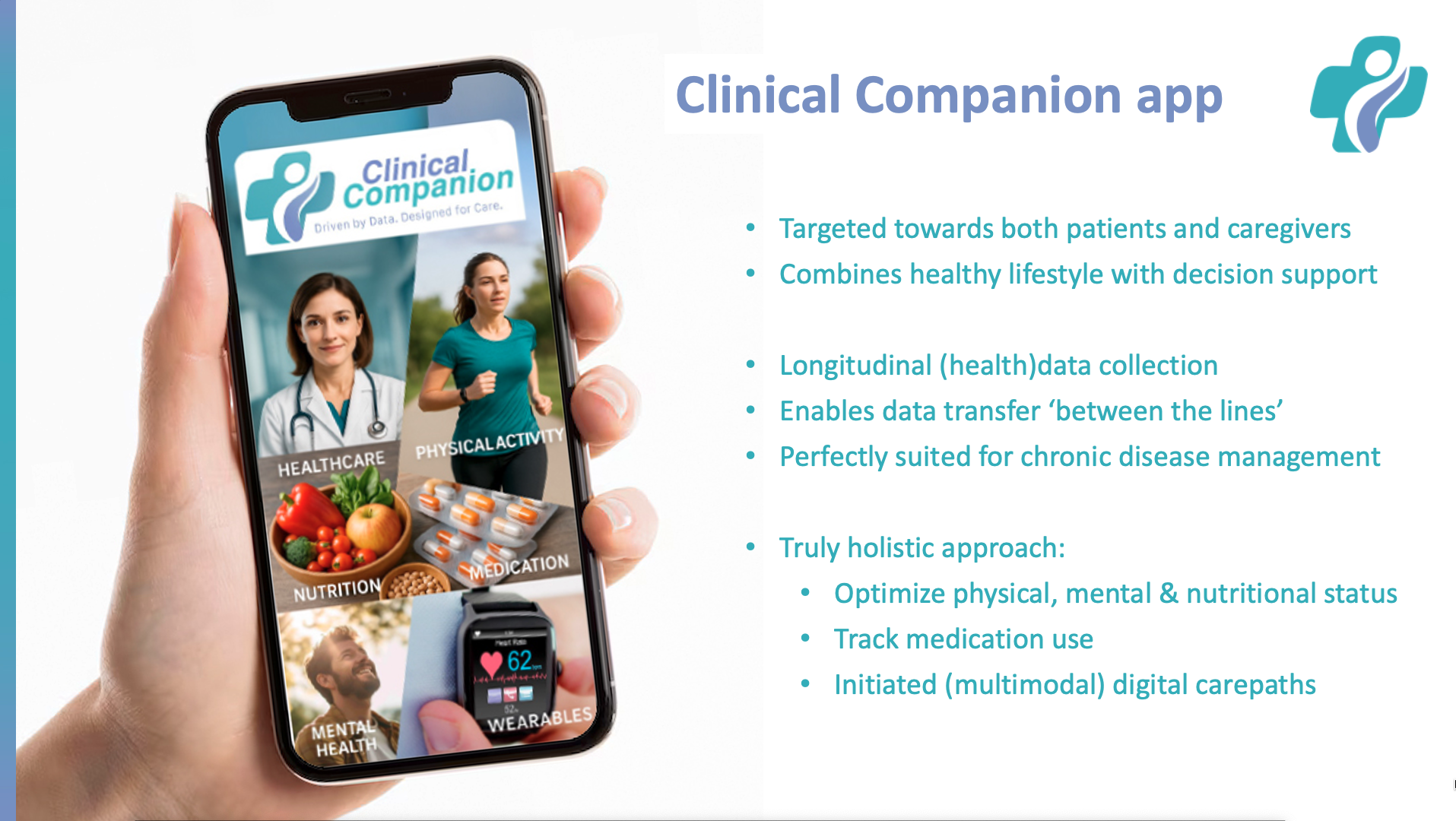 ClinicalCompanion turns passive data into actionable insight, enabling earlier intervention, more timely adjustments, and patient-centric engagement. For chronic-care programmes, this means improved outcomes, fewer acute events, enhanced adherence, and deeper insights into lifestyle–disease interactions. It bridges the gap between “in-clinic snapshots” and continuous real-world health, enabling care teams to intervene before deterioration becomes critical.