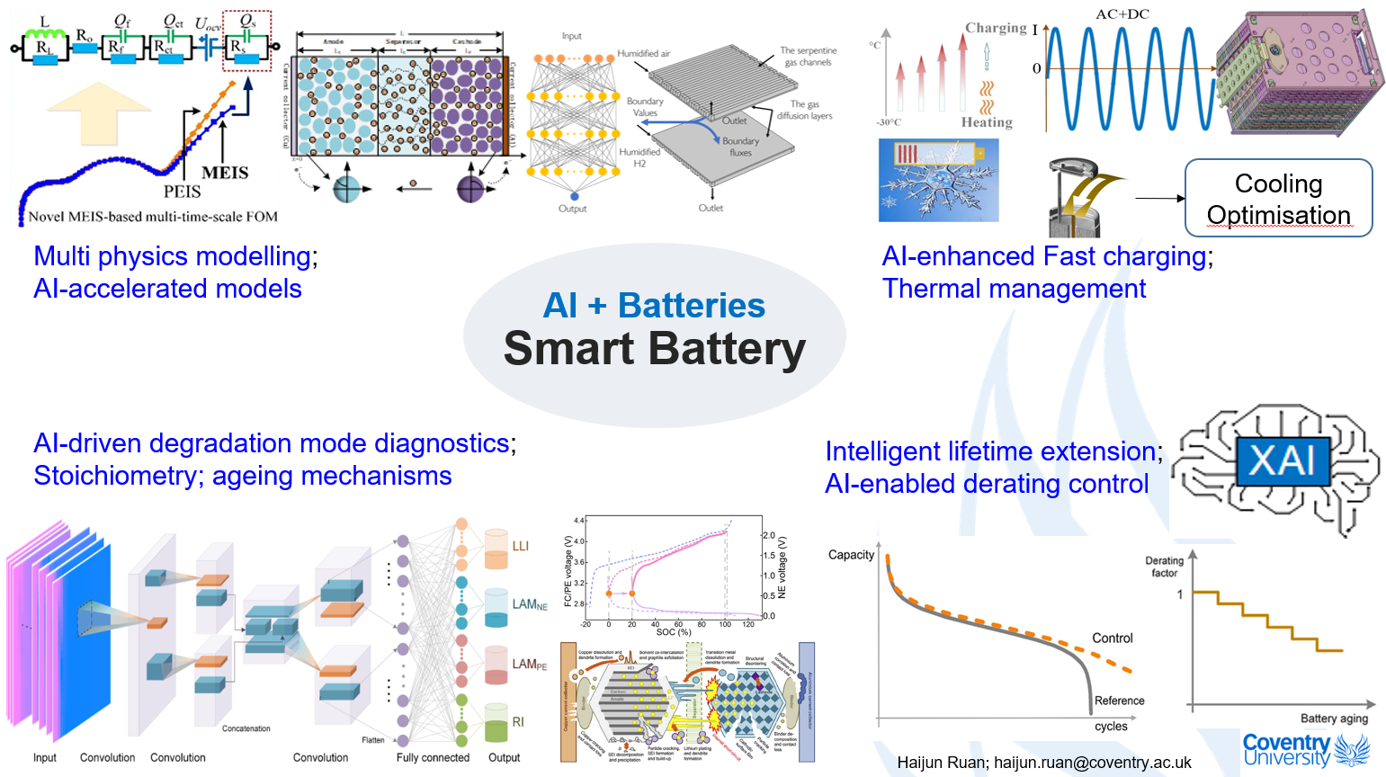 CECG sits in Coventry University’s £50m Centre for Advanced Low Carbon Propulsion Systems, established to partner with the propulsion system supply chain and accelerate the progression to carbon-zero transport. We are focused on four core research areas: Electrochemical energy storage; Hydrogen fuel cells; Power electronics & Electric machines. Our facilities enable wide range of activities in energy storage research – from cell assembly, through formation to precise battery grading and diagnostics, performance and safety evaluation, to recovery. Particular focus is put on advanced battery diagnostics – developing novel thermodynamic sensing techniques, such as thermal, electrochemical, pressure, magnetic, strain and other, ranging from miniature quasi-reference electrodes, co-located micron-scale temperature probes, to nano-plasmonic fibre-based lithium sensing, from in-cell up to module level deployment. In combination with in-house Machine Learning capabilities and adaptive BMS, our custom battery diagnostics approach can offer game changing advances in Battery Management Systems and battery behaviour tracking and prognostics.