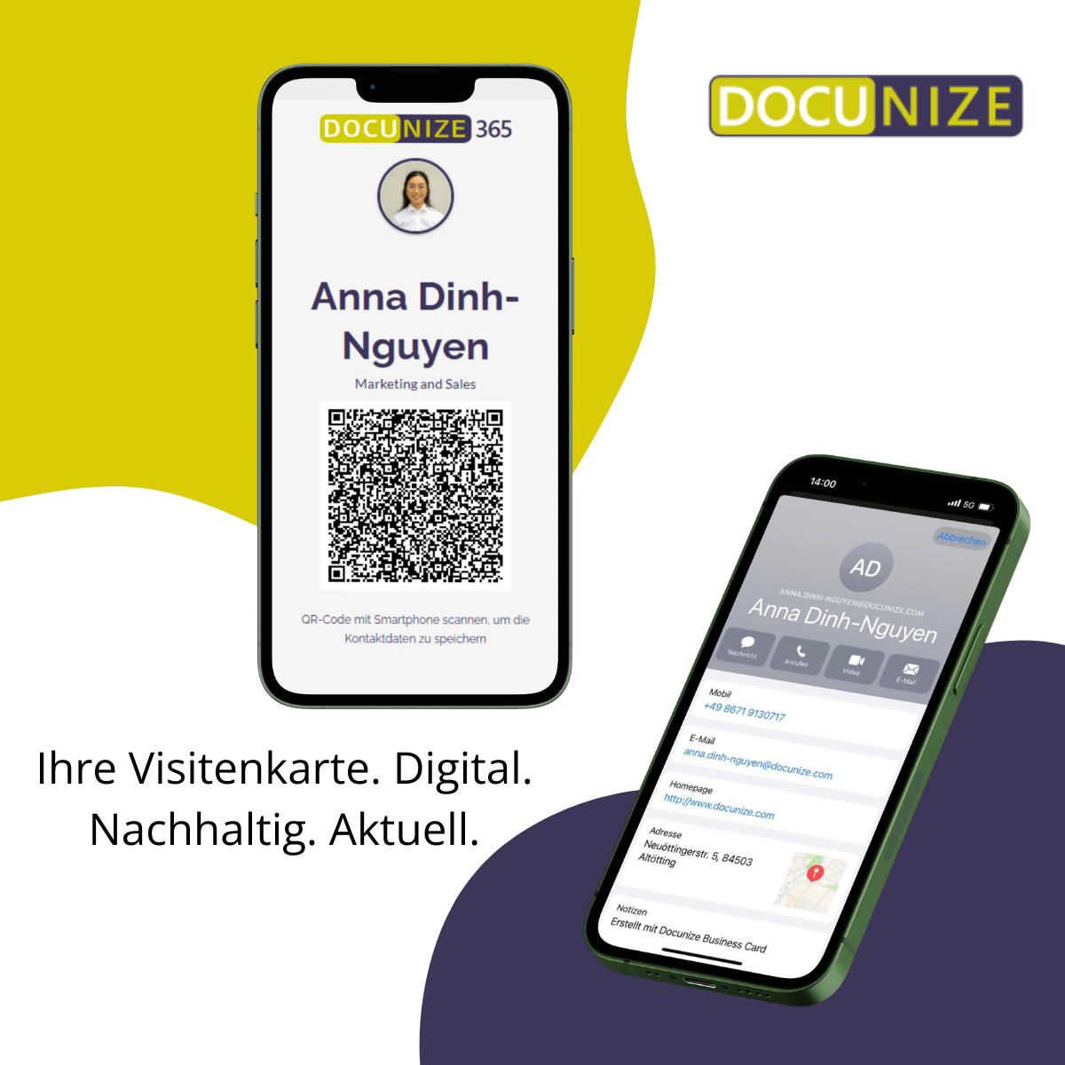 DOCUNIZE digitale Visitenkarte: Kontaktdaten teilen per QR-Code – CI-konform, nachhaltig, zentral steuerbar.