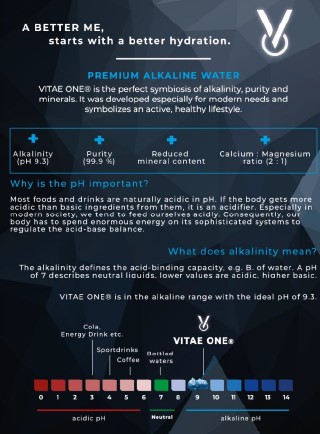 The VITAE ONE® is the perfect symbiosis of alkalinity, purity and minerals. An alkaline premium water, developed with attention to modern needs, symbolizes a healthy and active lifestyle.