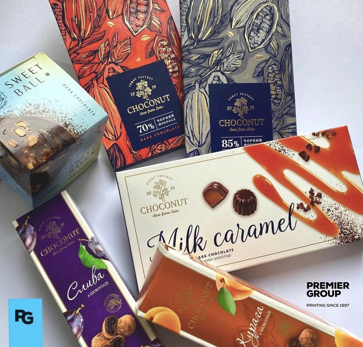 сonfectionery: tailored boxes for chocolate bars, pralines, and small assorted candies.