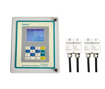TF1100-DC Dual-channel Wall-mounted Transit Time Ultrasonic Flowmeter works on the transit-time method. The clamp-on ultrasonic transducers (sensors) are mounted on the external surface of the pipe for non-invasive and non-intrusive flow measurement of liquid and liquefied gasses in fully filled pipe. Two pairs of transducers are sufficient to cover the most common pipe diameter ranges.