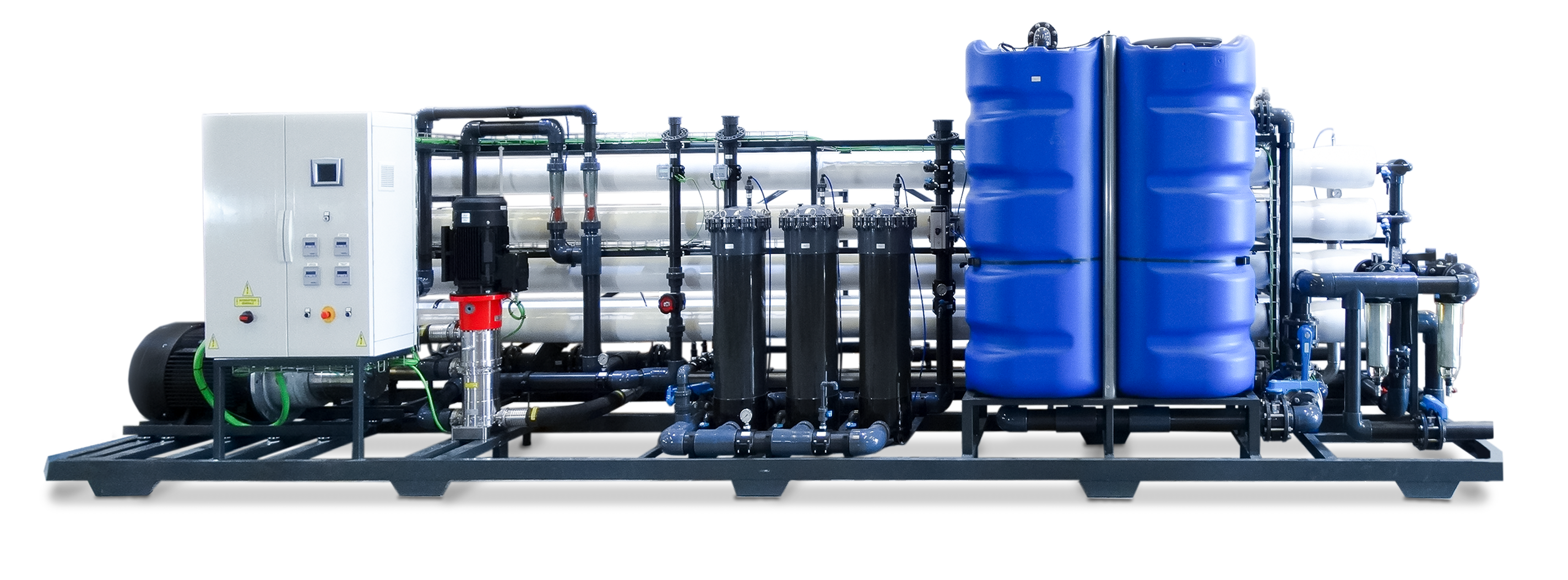 Sistemas de ósmosis inversa diseñados para la desalación de agua de mar, produciendo un agua con una salinidad inferior a 500 ppm. y eliminando gran parte de las impurezas presentes . Diseñados especialmente para aplicaciones de potabilización, agua de servicio y aguas de diferentes procesos industriales cercanos a la costa.