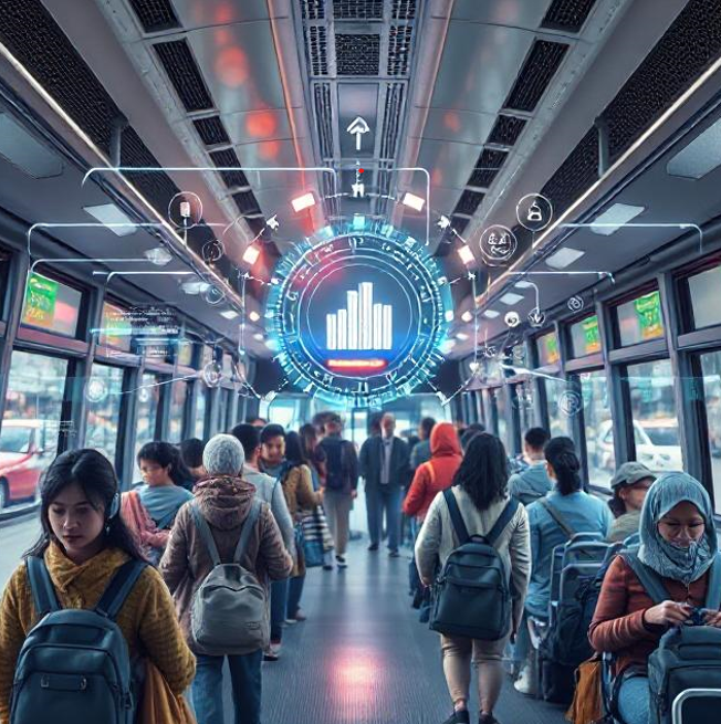 Develop an intelligent system to monitor mobility and behavior of bus station users, including person counting and service usage analysis with disaggregation by gender, age, and physical disability. The system should analyze mobility patterns, perceived safety, and adapt communication and advertising media to diverse audiences, ensuring inclusion and accessibility.