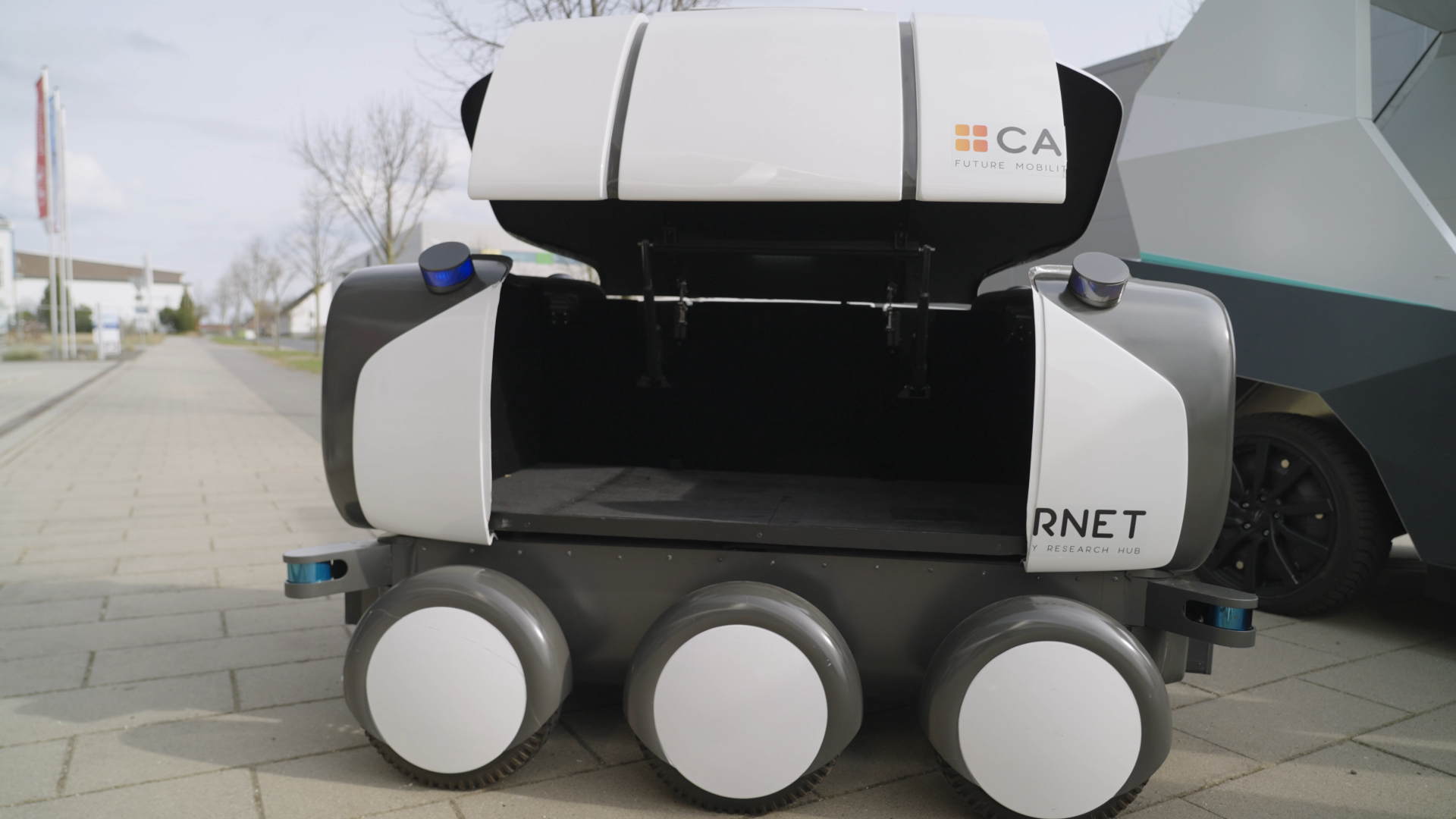 Ona is a six-wheeled electric vehicle with a payload capacity of up to 100 kg and a volume of 1 cubic meter that enables efficient, sustainable, and convenient delivery of goods. It boasts an L4 autonomy level and integrates advanced autonomous navigation technologies based on cameras, LIDAR sensors, inertial measurement units, and others. It is a modular vehicle designed to adapt to various use cases, enabling operation on streets and pedestrian areas, as well as in controlled environments such as university campuses or airports.