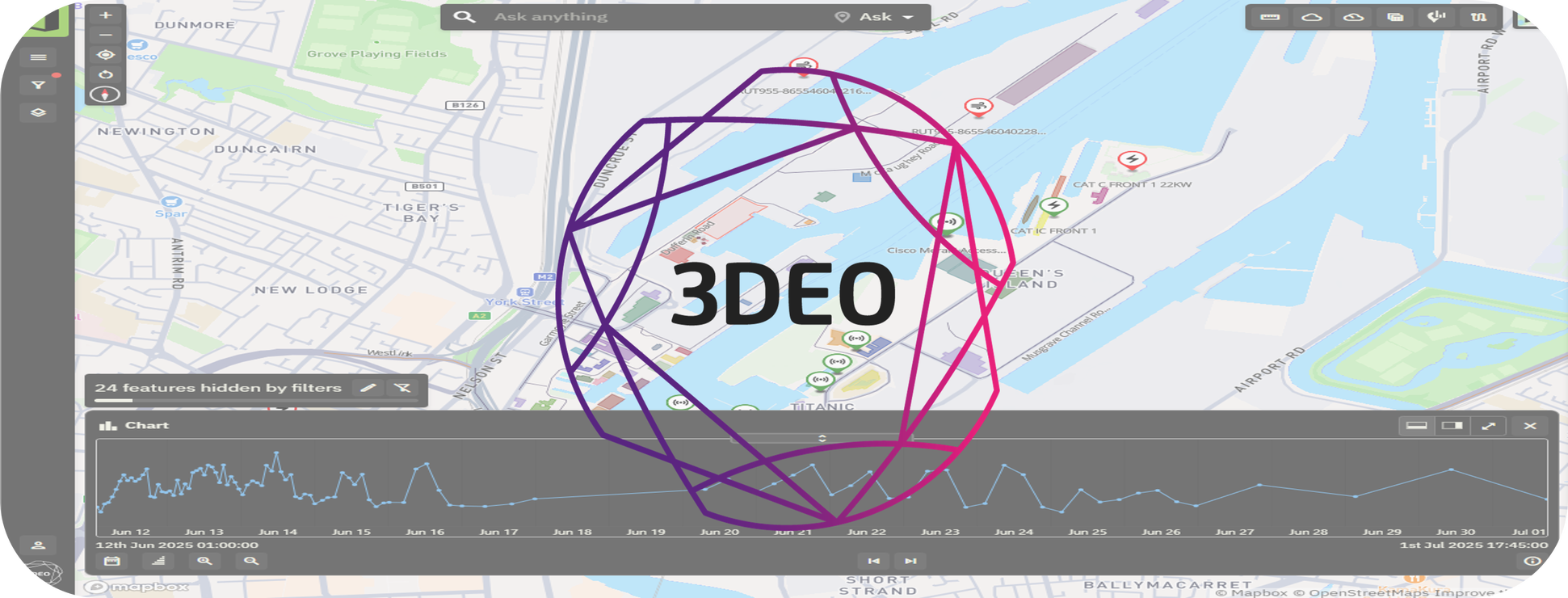3DEO offers Active Maps, an advanced digital twin and IoT data aggregation platform designed to empower smarter, more sustainable cities. By bringing together diverse datasets including infrastructure records, mobility data, environmental sensors, connectivity networks, and live operational feeds, Active Maps provides a single, intuitive platform for analysis and decision-making.