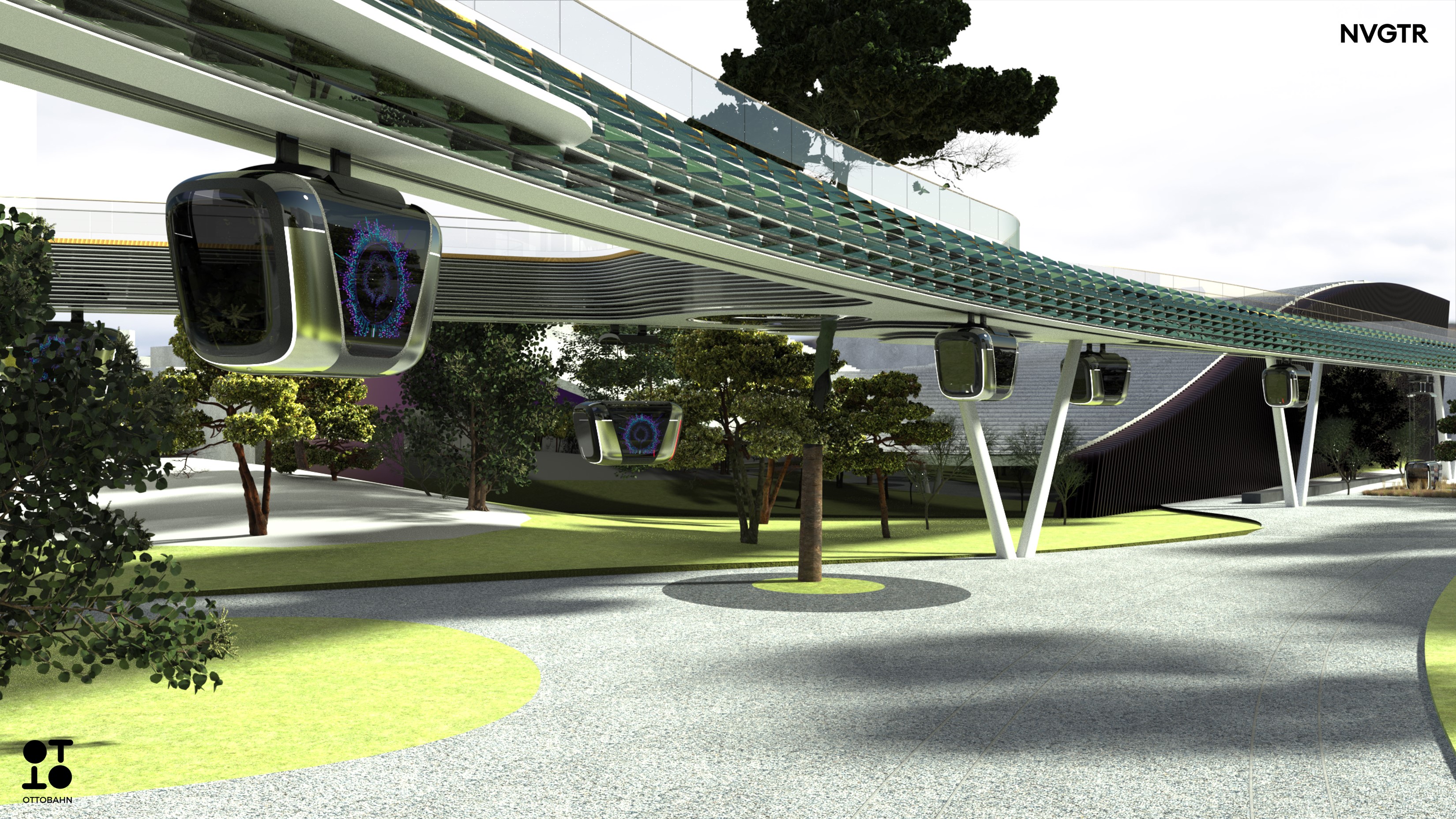 Ottobahn makes public transportation easy and sexy again – a pleasure to use by people and a pleasure to operate by cities. It’s a suspended railway 10m above today's traffic running on proven railway technology. All trips are direct from start to finish without intermediate stops, making trips very quick. Our patented passive switches reduce downtimes and maintenance costs.The pods combine the comfort of a personal car with the sustainability of public transport. They can be lowered to the ground everywhere along the tracks, eliminating the need for building and maintaining expensive stations.
