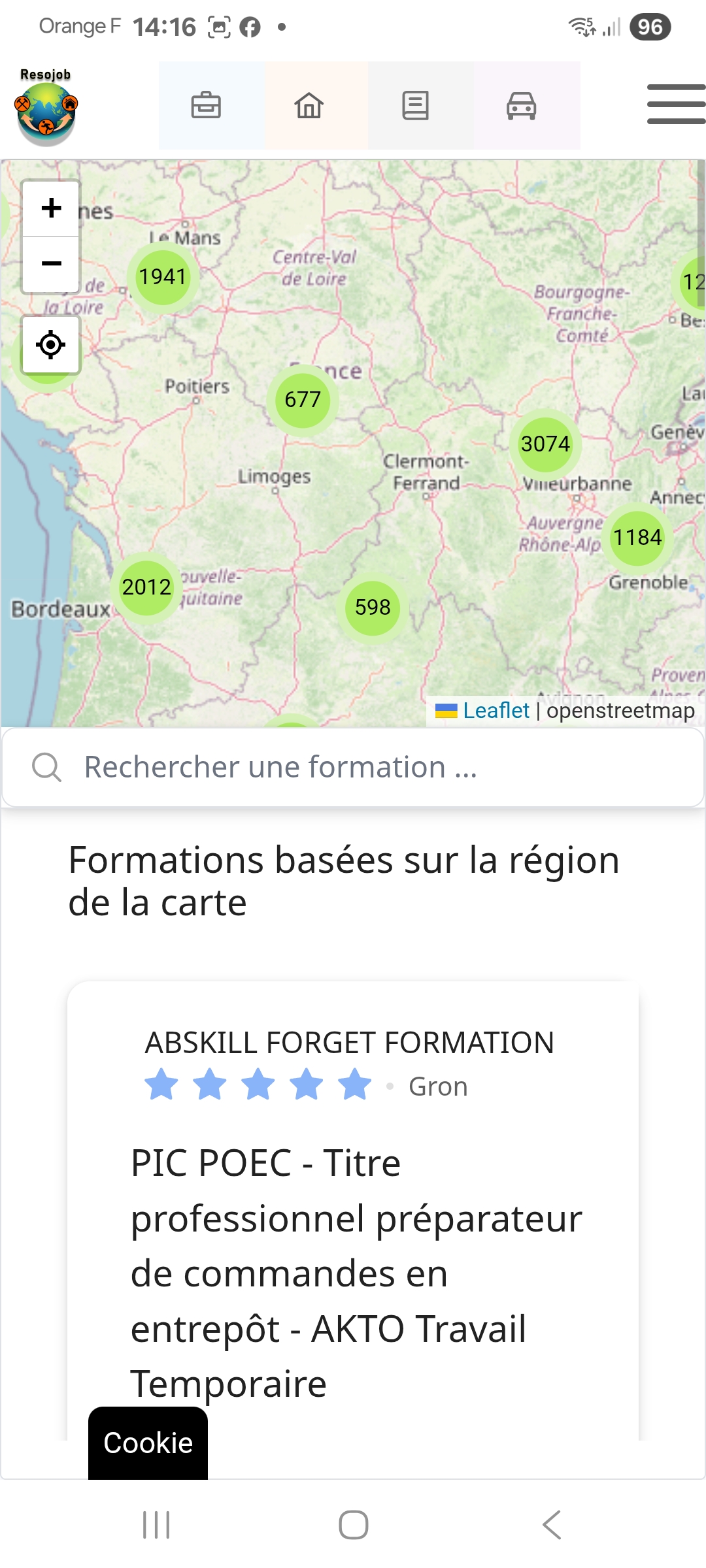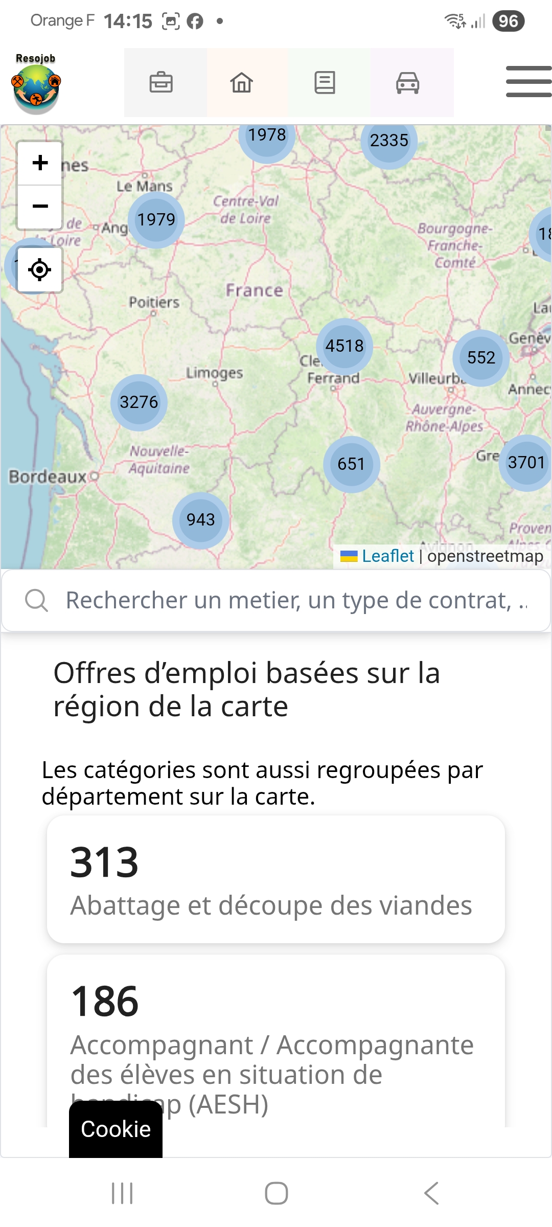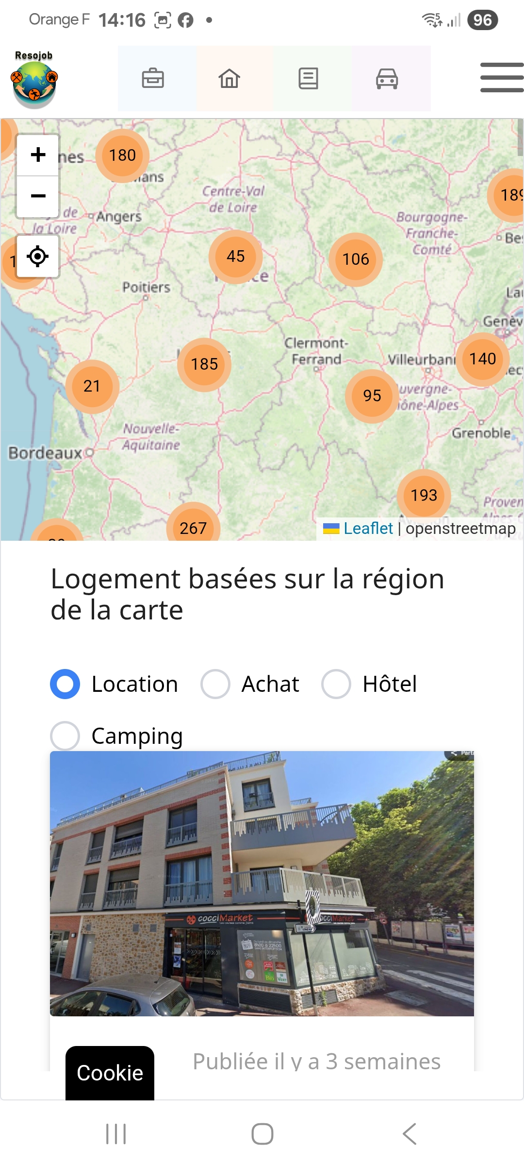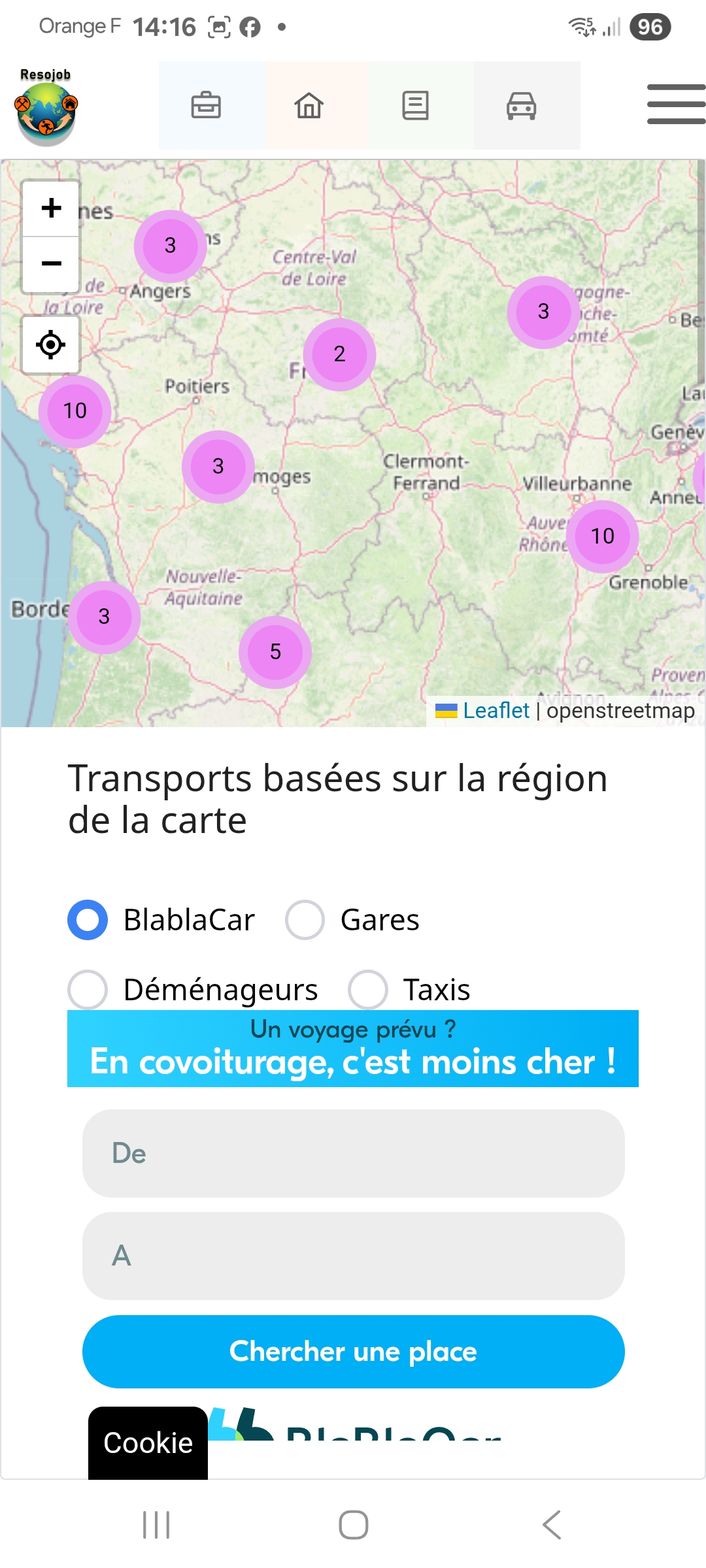Resojob. c'est un outil favorisant l'accès au plein emploi via un moteur de recherche et de mise en ligne gratuit à l'aide du carte intéractive, ouvert aux particulier et aux entreprises pour rechercher ou diffuser sur l'ensemble des territoires toutes offres d'emploi(tous types de contrat), toutes formations et les centres qui en proposent, tous types de logements (à la vente ou location) et des hébergements(hotels et campings),ainsi que des solutions de mobilités et de transports jusqu'au derniers kilomètres Sncf,Blablacar et Taxis (toutes compagnies)via une reservation et commande en ligne et la géolocalisation des aires de prises en charges et les coordonnées de toutes les gares et déménageurs professionnels,service Saas pour l'envoie de cv, catégories spécifiques Sénior(pénibilité réduite),Alternant, Saisonnier.Messagerie,service de référencement prenium et partenariat proposés.