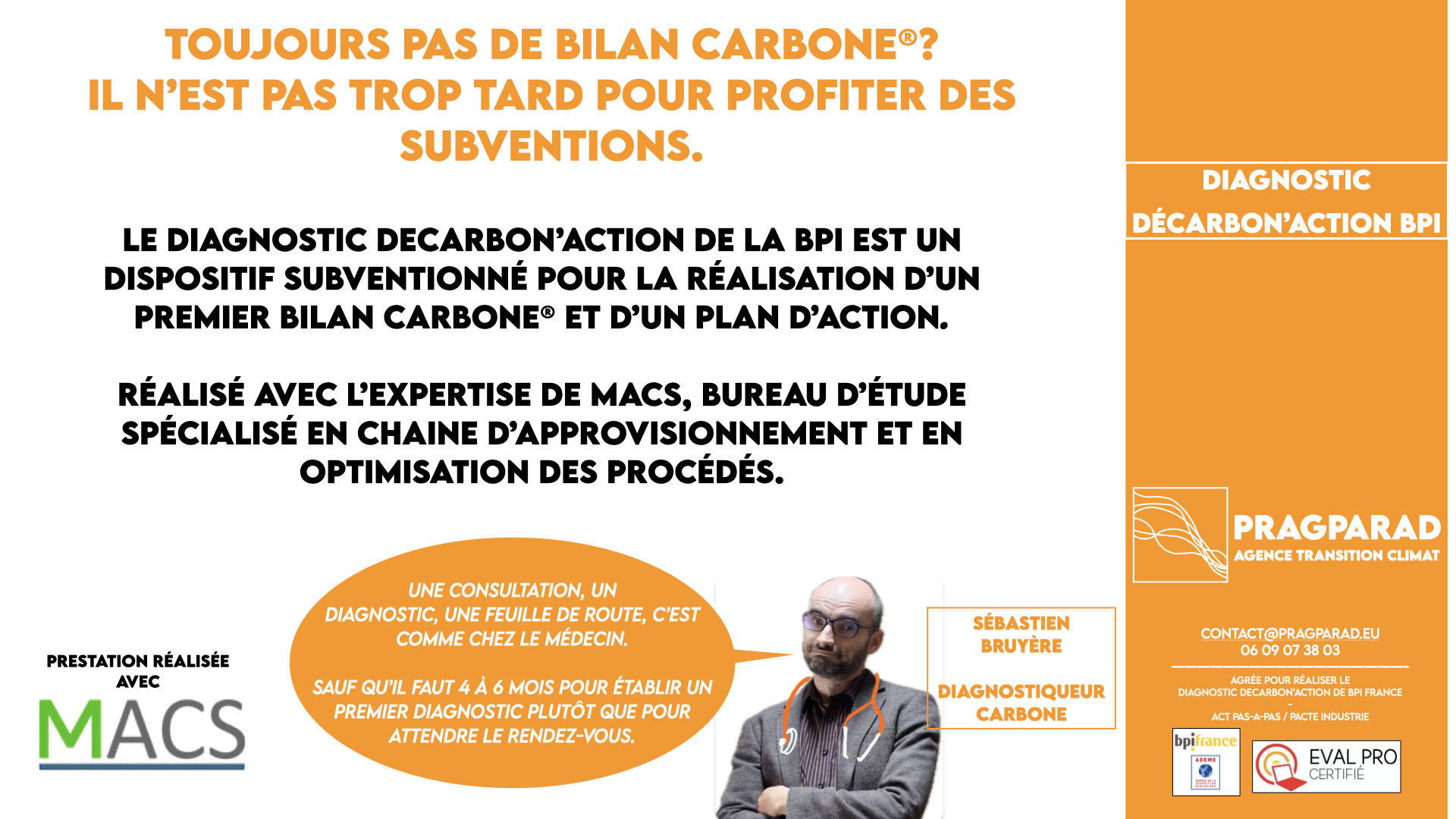 Le diagnostic Décarbon'action de la BPI est un dispositif subventionné et standardisé de réalisation d'un premier Bilan Carbone au format réglementaire et de la construction avec vos équipes d'un premier plan d'action de décarbonation.