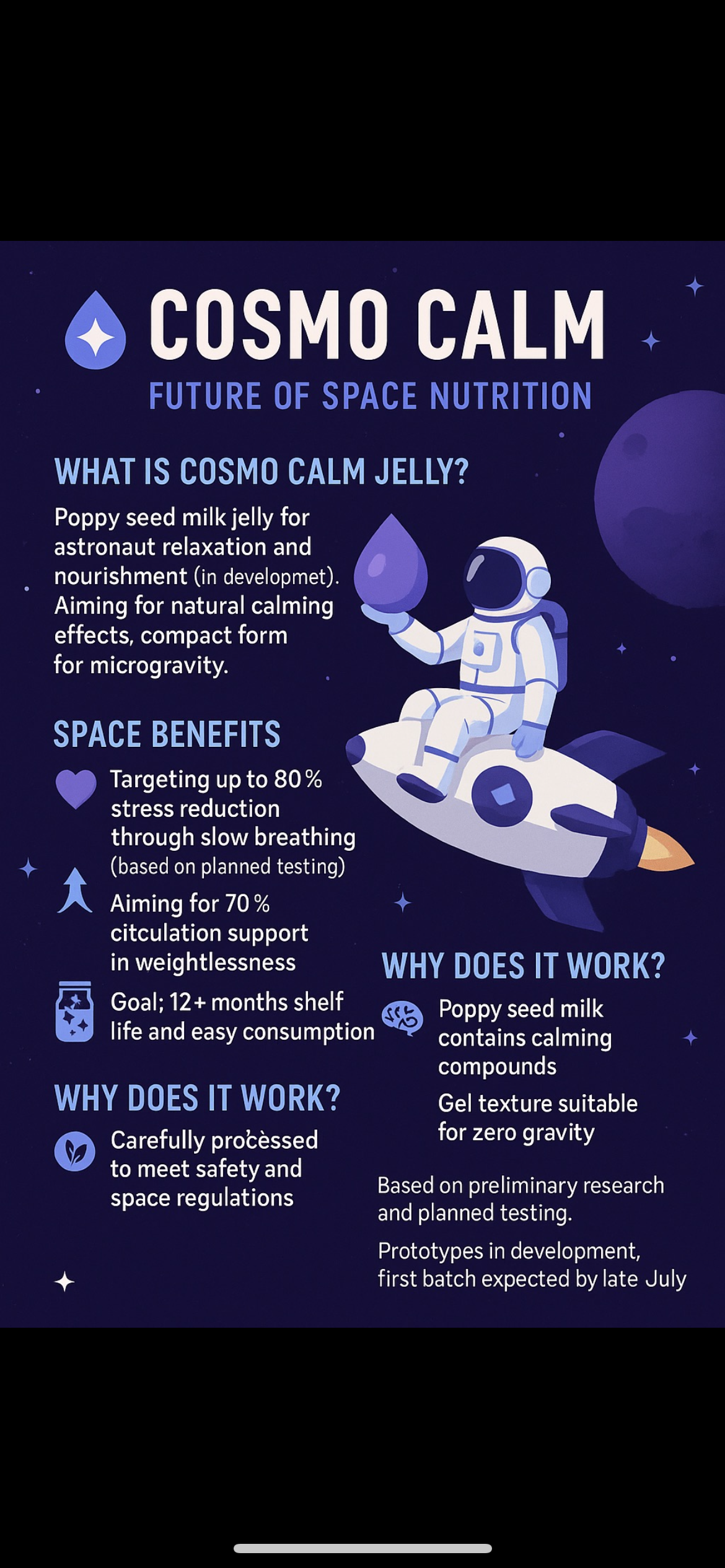 We are developing a unique poppy-based jelly designed to support astronauts’ mental calm, helping to stabilize their nervous system and reduce CO₂ production associated with stress and agitation — a crucial factor in the closed environments of space missions.