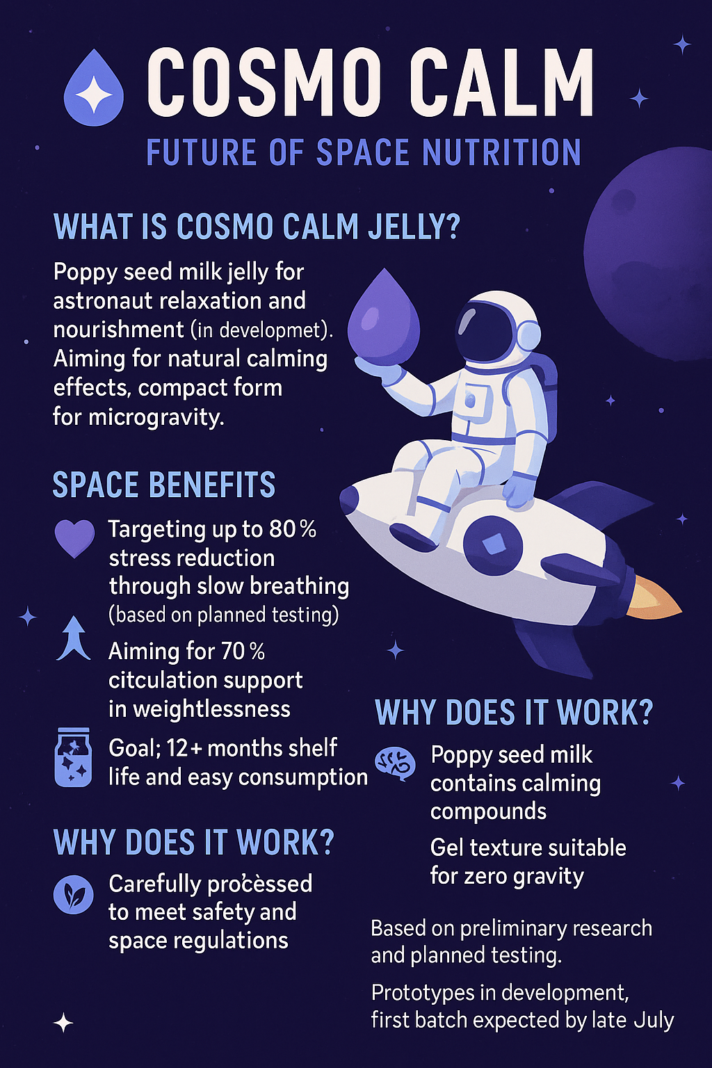 Aktuálně vyvíjíme unikátní makové želé určené pro astronauty, které pomáhá zklidnit nervovou soustavu a tím snižovat produkci CO₂ spojenou se stresem a neklidem — což je klíčové pro bezpečnost a stabilitu v uzavřeném prostředí vesmírných misí.