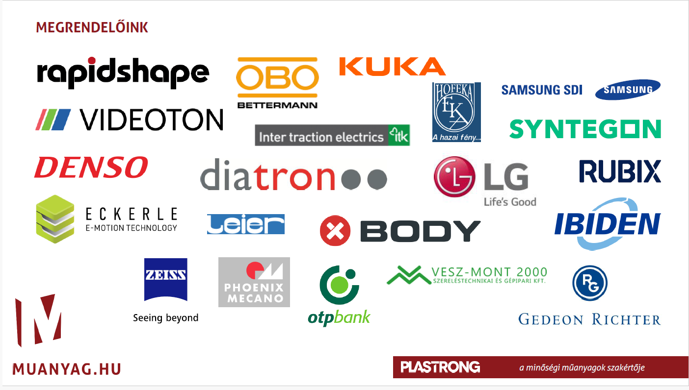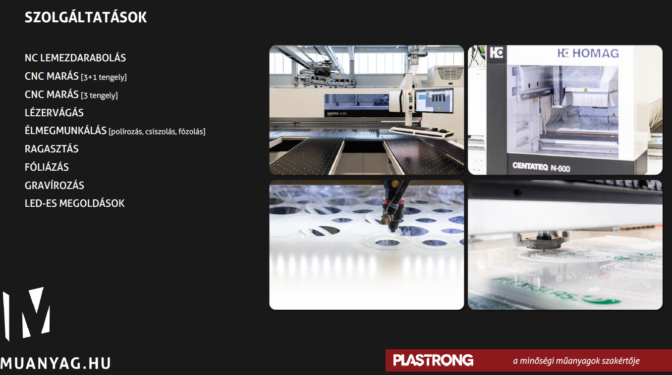 Az alábbi anyagokat tudjuk biztosítani partnereink számára: PE-HD, PVDF , TEFLON , PVC, PC, PMMA, PE500, PE 1000 , PE55 , POM , PA66GF, ZX100, PTFE, PET , PA , PET, PVDF, Textit és egyéb műszaki műanyagok(lágy PVC , ipari járórácsok, PE láncvezetők, acélprofilok ) . Mindezek mellett cégünk vezető termékei a Polikarbonat ( PC ESD is) gépburkolatok és Plexi anyagok különböző típusai.