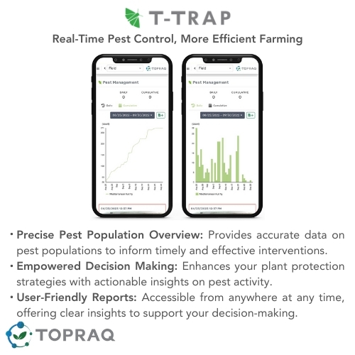 By reducing dependency on manual pest monitoring and decreasing the use of chemical pesticides, T-Trap supports Integrated Pest Management (IPM) strategies, promoting eco-friendly pest control while protecting biodiversity. Its ability to monitor pests continuously ensures accurate predictions of infestations, helping farmers optimize resource use and reduce environmental impact.