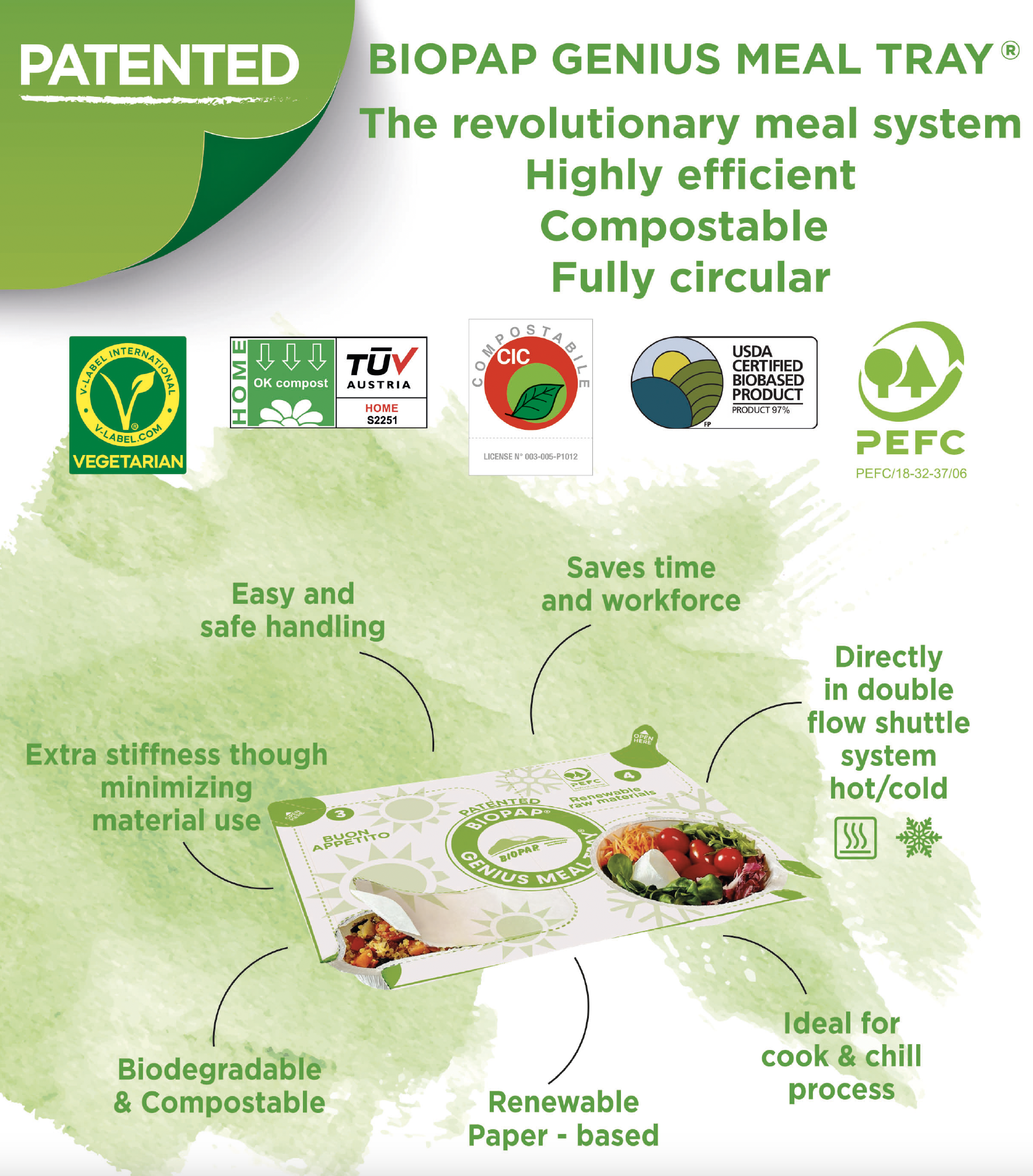 BIOPAP® Vision and Experience. A system of patented, biodegradable and compostable food packaging solutions resistant to extreme temperatures. We started over 22 years ago by imagining the latent desire of consumers for sustainable food containers, suitable to operate from freezing to oven conditions and consistent with organic and controlled supply chains. Our approach is to eco-design all our packaging solutions starting from renewable raw materials, ending in biological circularity, improving operational efficiency and minimizing material needs. We operate in ZERO CO2 emission plants using only electric energy from renewable resources, manly produced by our own solar power plants. Today, we are unique, with an exclusive experience in high performance compostable food containers suitable for Cook & Serve, Cook & Chill and Cook & Freeze process. We have applications running on all continents. BIOPAP® containers feed premium and organic food dynamics, satisfying the growing environmental awareness and the functional expectations of producers and consumers. Our main application areas are school, hospital, corporate catering, ready-made meals, meal delivery, retailers’ deli counter services, air and rail catering.