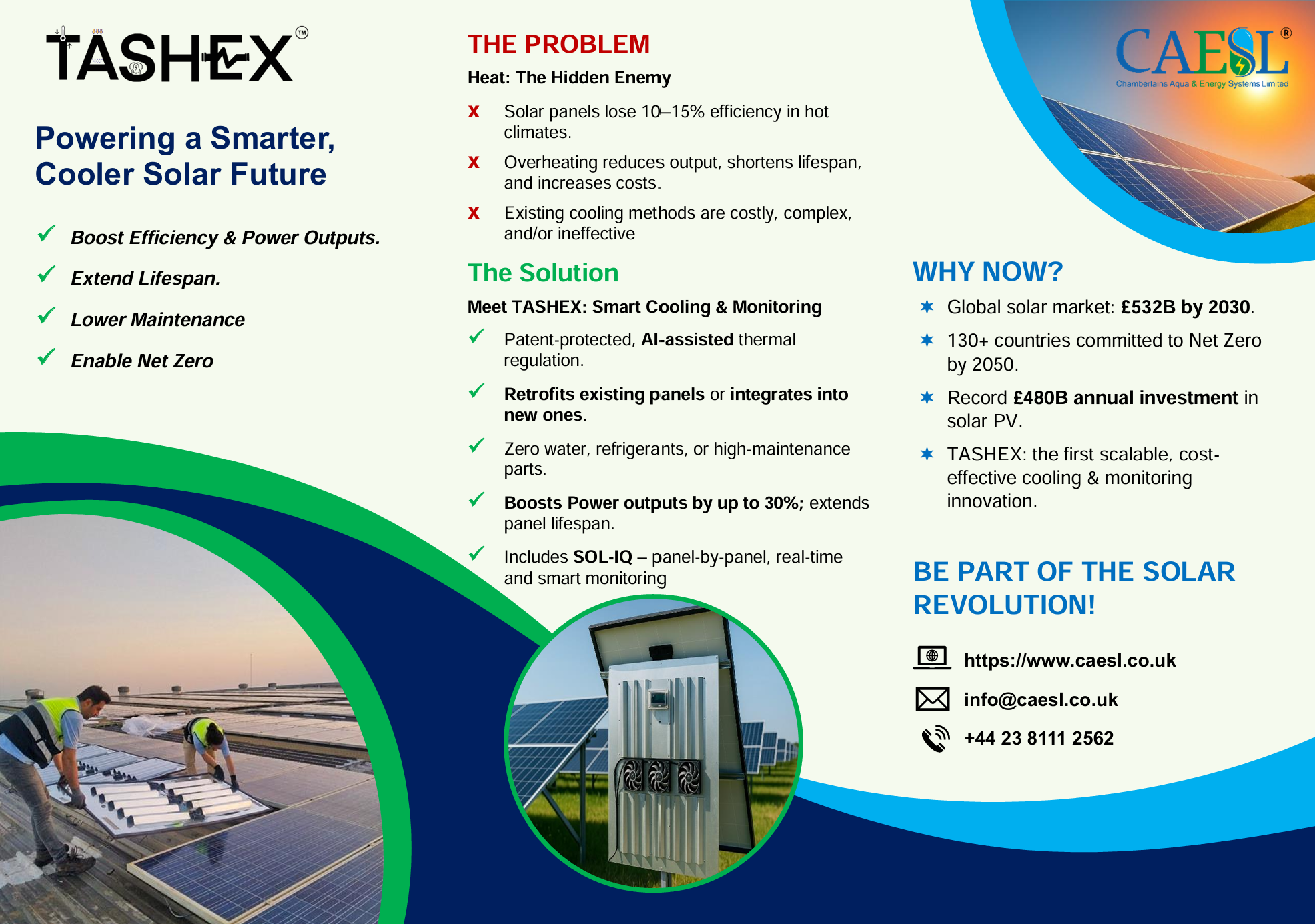 TASHEX is a patented AI-driven thermal management and optimisation system that reduces solar panel overheating and increases yield by up to 25–30% in hot/moderate climates. It provides panel-level monitoring, predictive maintenance, and improved long-term reliability. We are seeking distributors, EPC partners, and manufacturers interested in integrating TASHEX into their solar solutions.