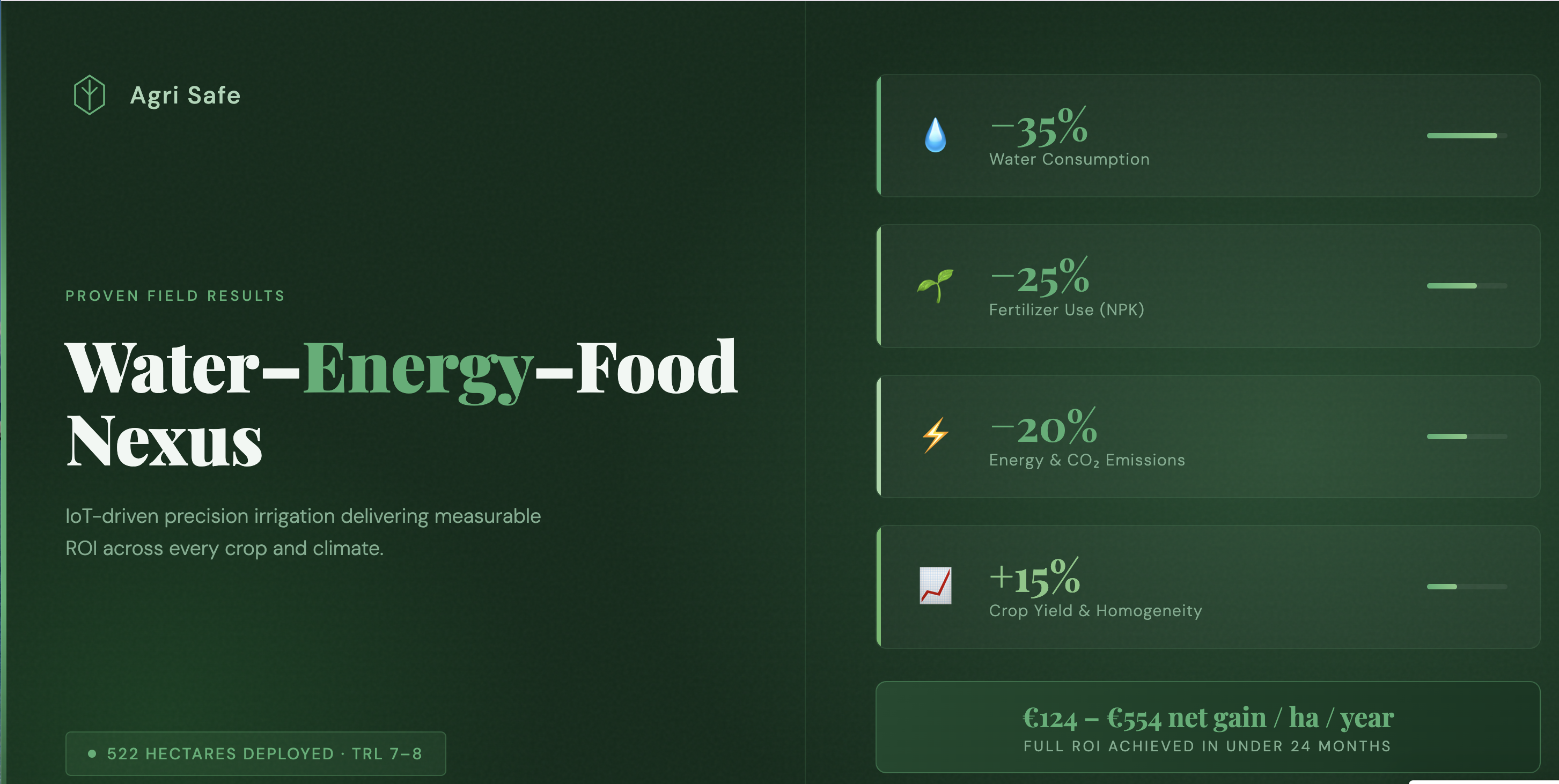 Already deployed on 522 hectares across olive groves, almond orchards, and vineyards. TRL 7–8. Pilots underway in Occitanie, France.