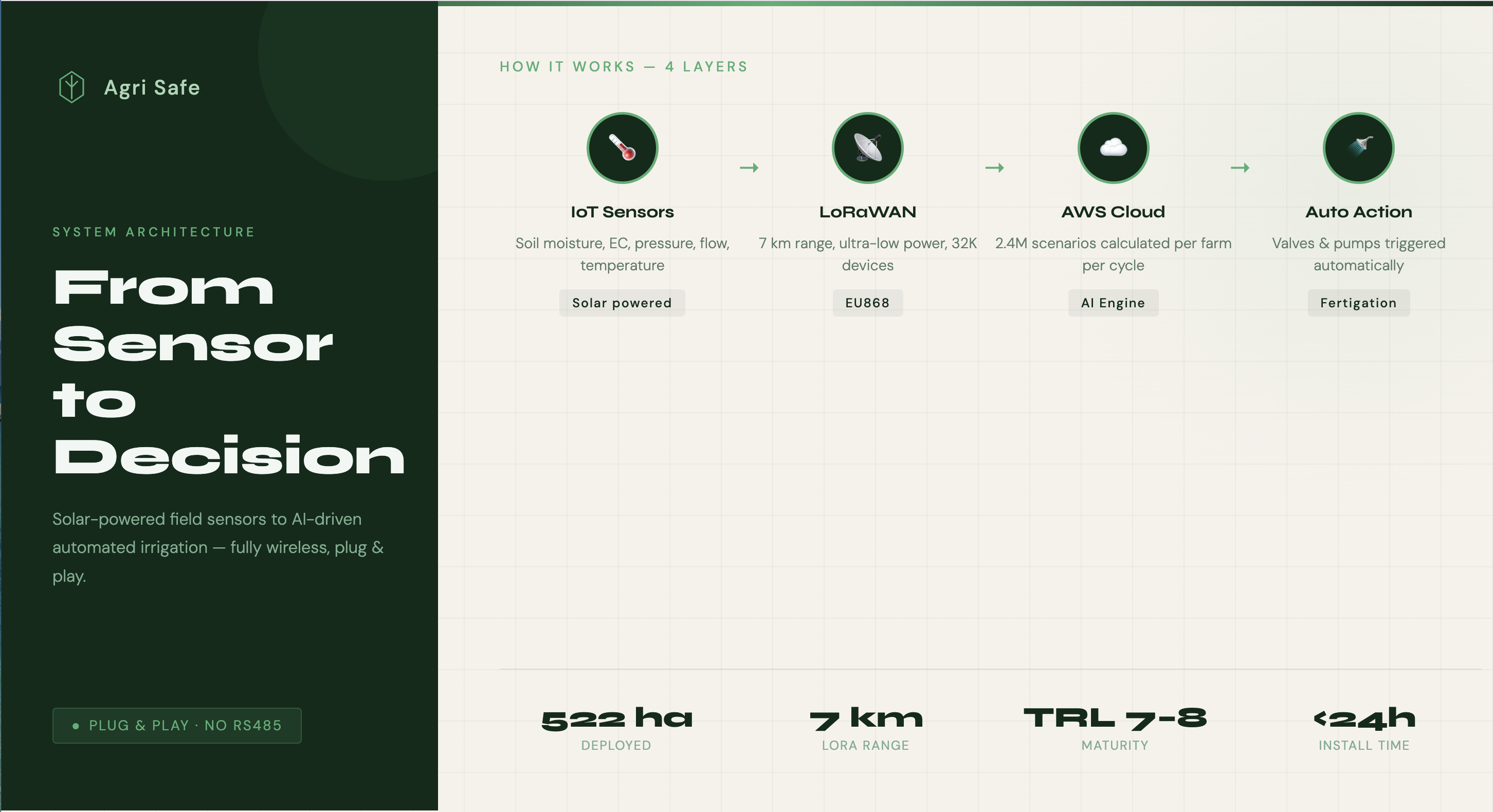 Agri Safe is a plug-and-play IoT system that automates irrigation and fertigation management for farms of all sizes. The system combines solar-powered field sensors (soil moisture, pressure, flow, EC/pH), a LoRaWAN network covering up to 7 km, and an AI-powered cloud platform — all without any complex software integration.