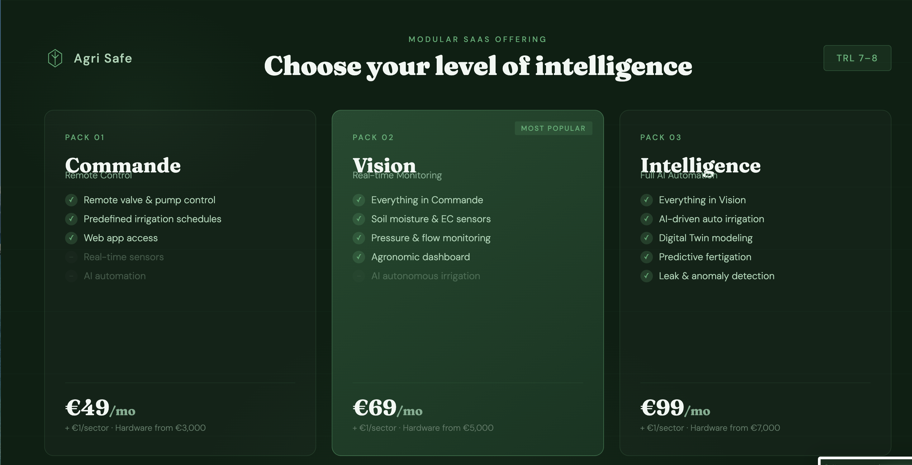 Hardware from €3,000. SaaS from €15/ha/year. Installation included.