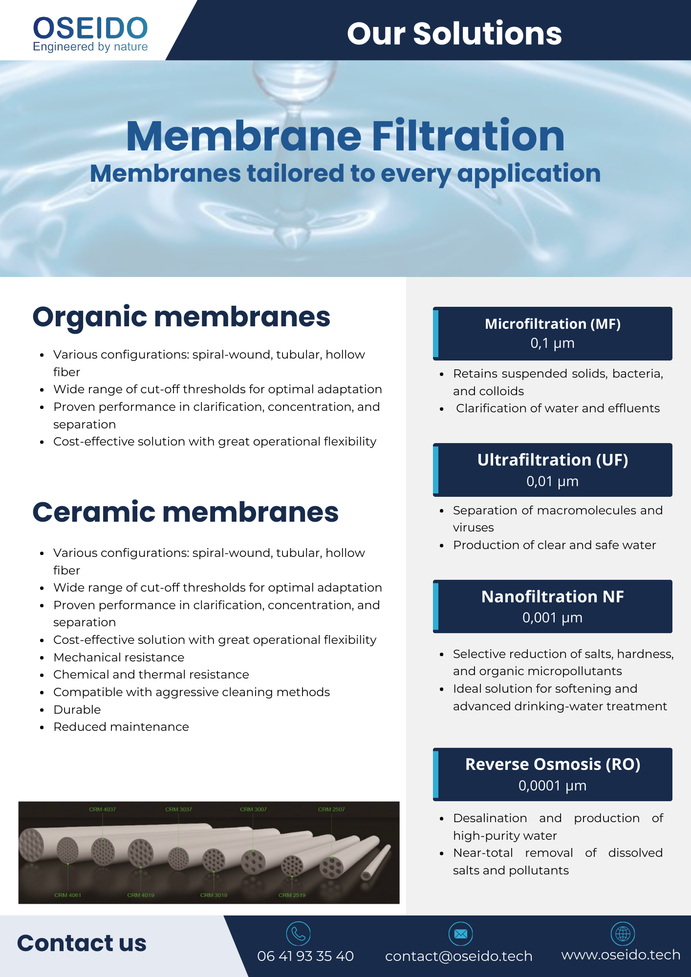 These tailor-made solutions enable efficient removal of suspended solids, micro-pollutants, and complex contaminants while minimizing energy consumption and maintenance needs. Adapted to demanding industrial, municipal, and reuse applications, our membrane technologies provide robust, high-performance filtration systems that support sustainable water management and resource recovery.