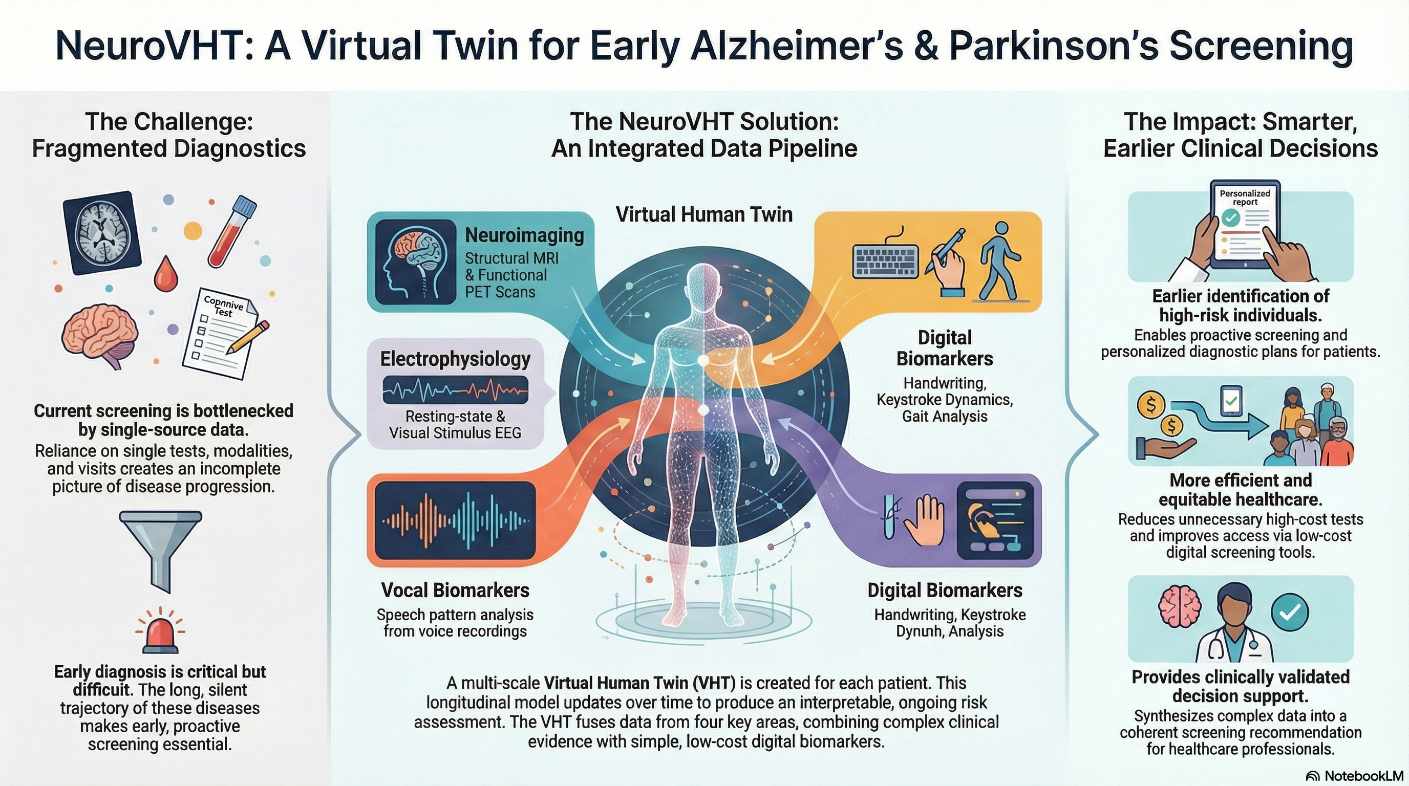 A multi-scale Virtual Human Twin that integrates brain structure/function and everyday digital biomarkers for decision support.