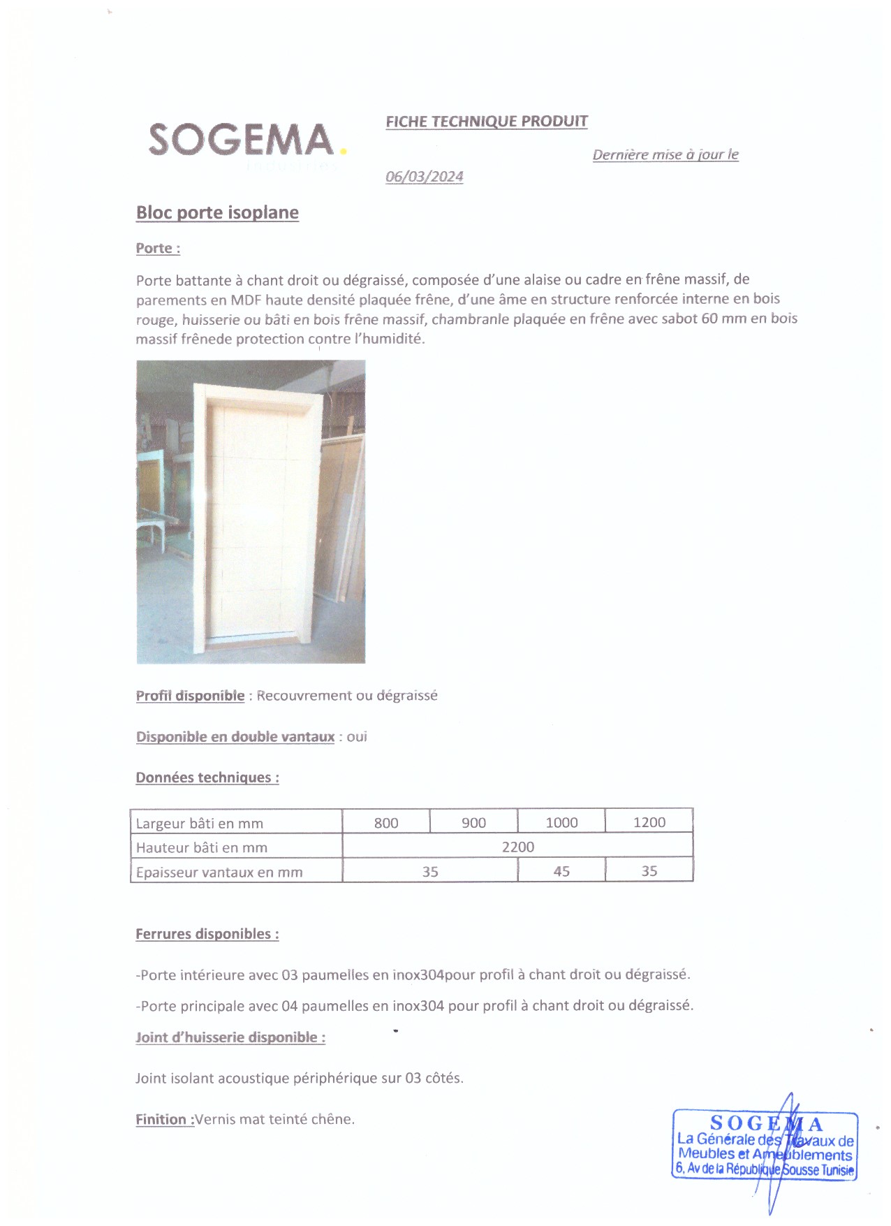 porte battante à chant droit ou dégraissé, composée d'une alaise ou cadre en bois massif,parement en MDF haute densité,d'une âme en structure renforcée interne en bois rouge,huisserie ou bâti en bois massif,chambranle plaquée avec un sabot de 60mm en bois massif.