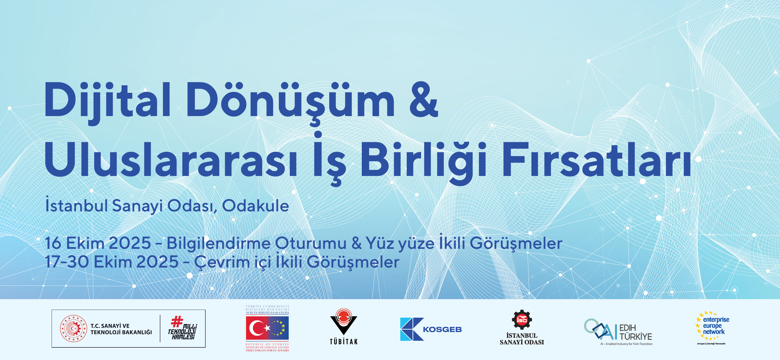 İstanbul Sanayi Odası (İSO) tarafından Sanayi ve Teknoloji Bakanlığı, TÜBİTAK ve KOSGEB iş birliğiyle düzenlenen "Dijital Dönüşüm ve Uluslararası İş Birliği Fırsatları" Bilgilendirme & İkili Görüşme Etkinliğine davetlisiniz. Yüz yüze ikili görüşmeler bu etkinlik kapsamında gerçekleştirilecektir.