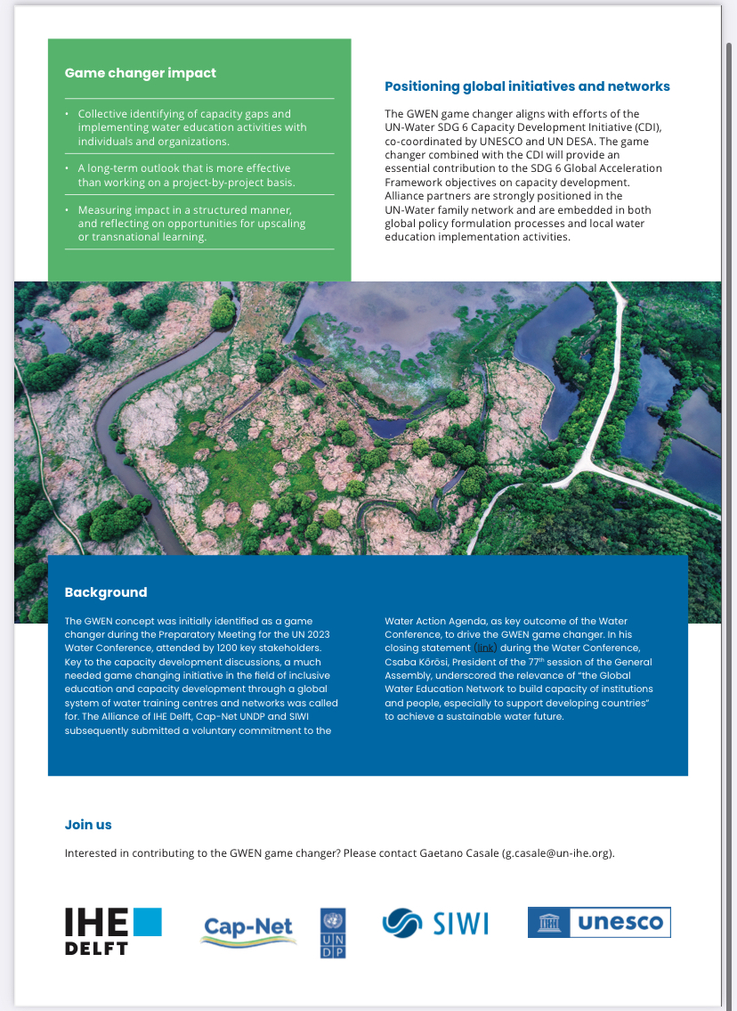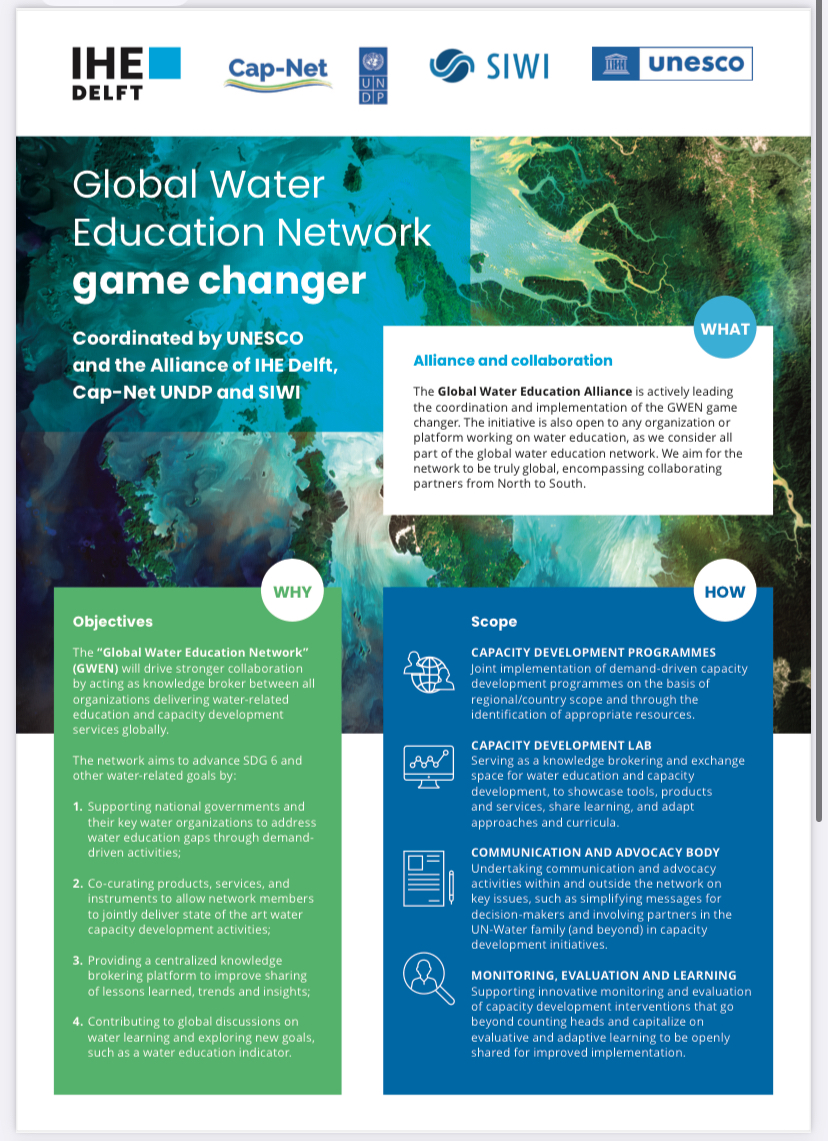 UNESCO and the Global Water Education Alliance of IHE Delft, Cap-Net UNDP and SIWI are founding partners and leading the coordination and implementation of the GWEN game changer, initiated and shaped in connection to the UN 2023 Water Conference and its resulting Water Action Agenda. The GWEN initiative is also open to any organization or platform working on water education, as we consider all part of the global water education network. We aim for the network to be truly global, encompassing collaborating partners from North to South. GWEN was officially launched at World Water Week 2023 in Stockholm.