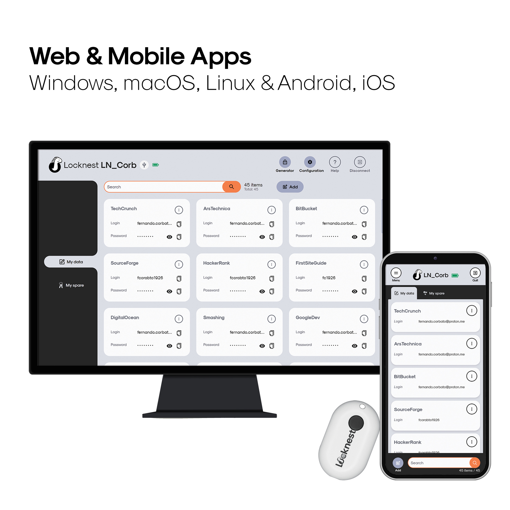 Locknest is a standalone, hardware password manager designed to protect user authentication data with maximum security. Fitting in the palm of your hand, this universal and autonomous device works across all platforms via USB and Bluetooth, eliminating reliance on the Cloud. By keeping credentials off computers and mobile devices, Locknest significantly reduces the attack surface to a single, encrypted key—only accessible when needed. Even in the event of a stolen device, authentication data remains completely secure.