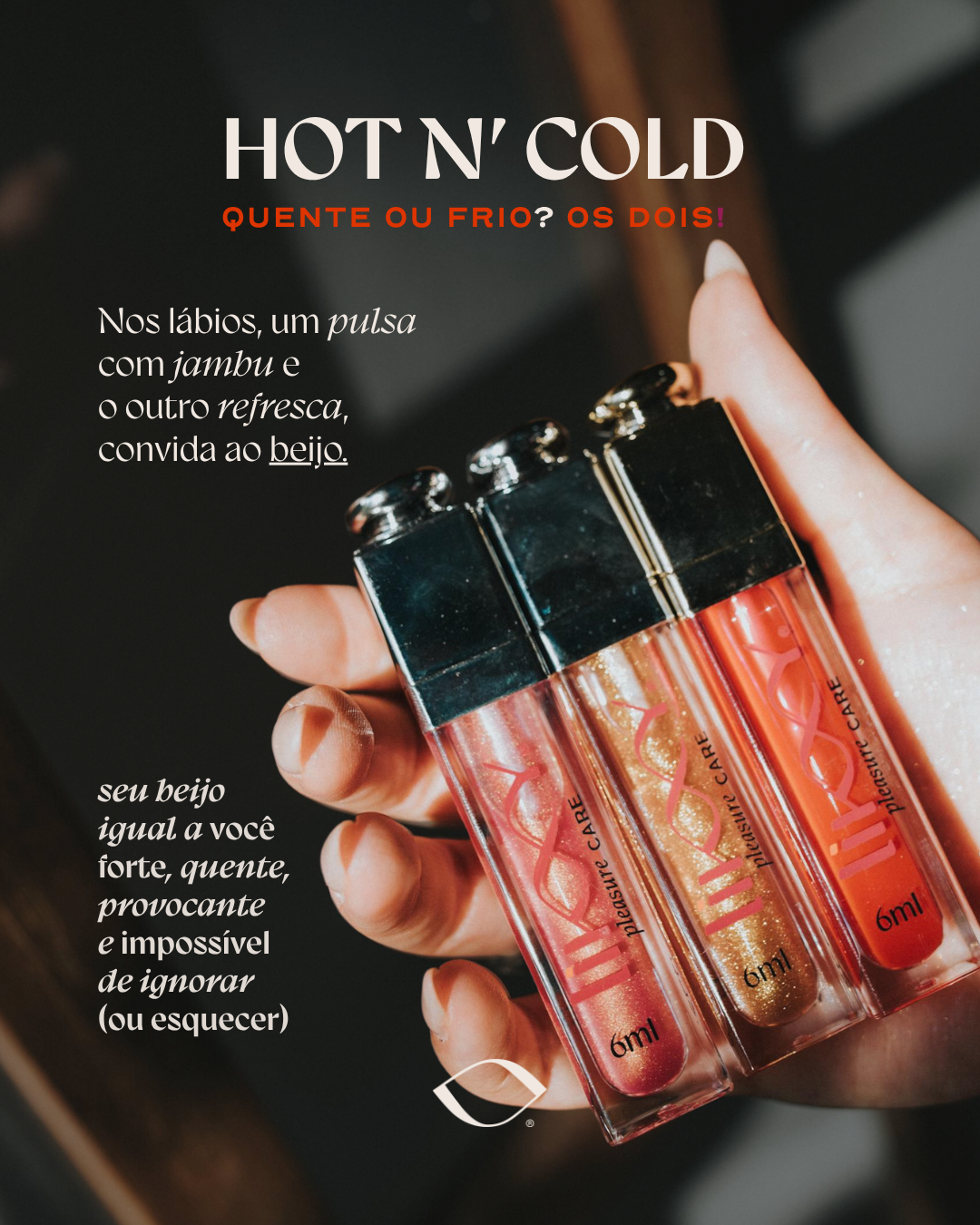 Ice, Ice Baby: gloss. Traz frescor, brilho e aquela sensação provocante de um beijo gelado que arrepia — só que mais gostoso.