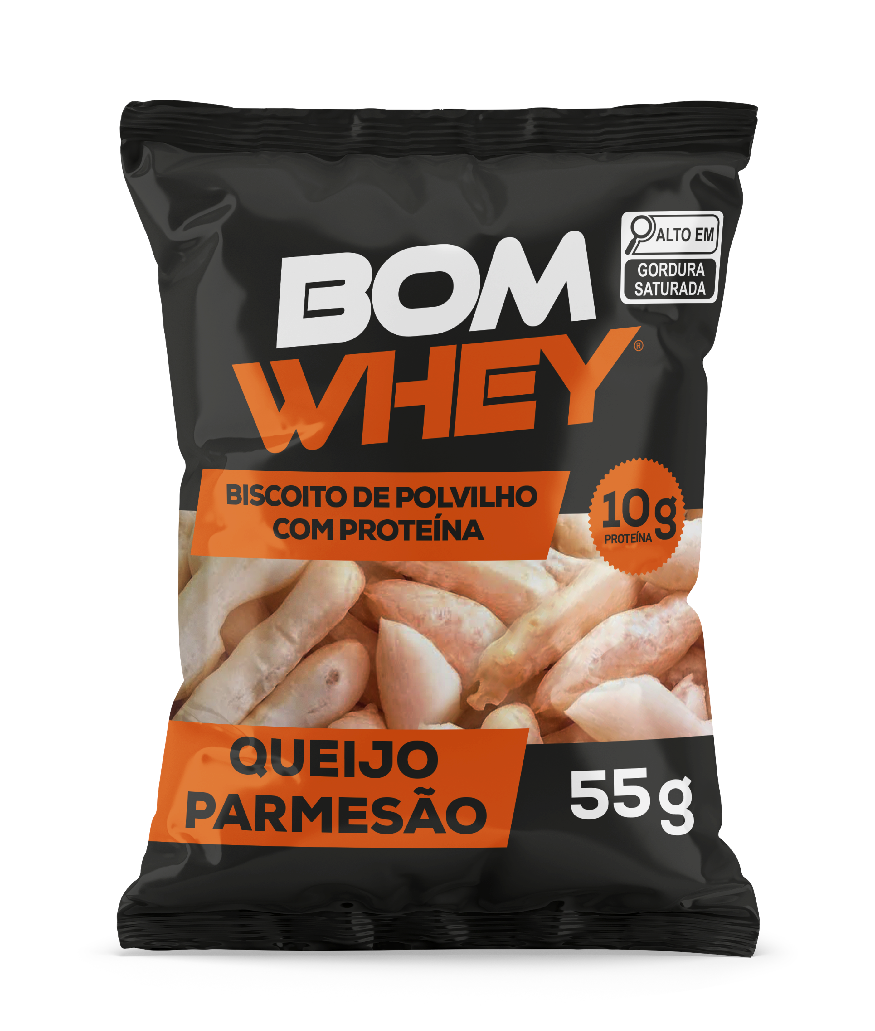 Biscoito de polvilho com proteína, a embalagem é com 55 gramas de produto e contém 10 gramas de proteína. O PRIMEIRO DO MUNDO!