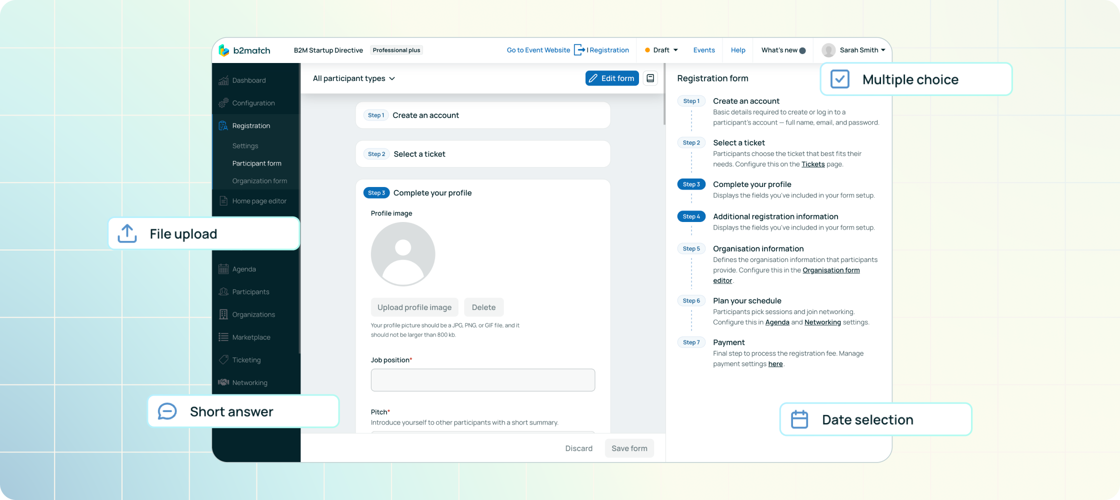 A clear, intuitive, and well-structured registration form sets the tone for the entire event experience. It shows professionalism, builds trust, and makes attendees feel confident about taking part. With the new b2match Registration Form Builder, event organizers can shape that first touchpoint exactly to their event’s needs, without dealing with complicated setups or technical barriers.
